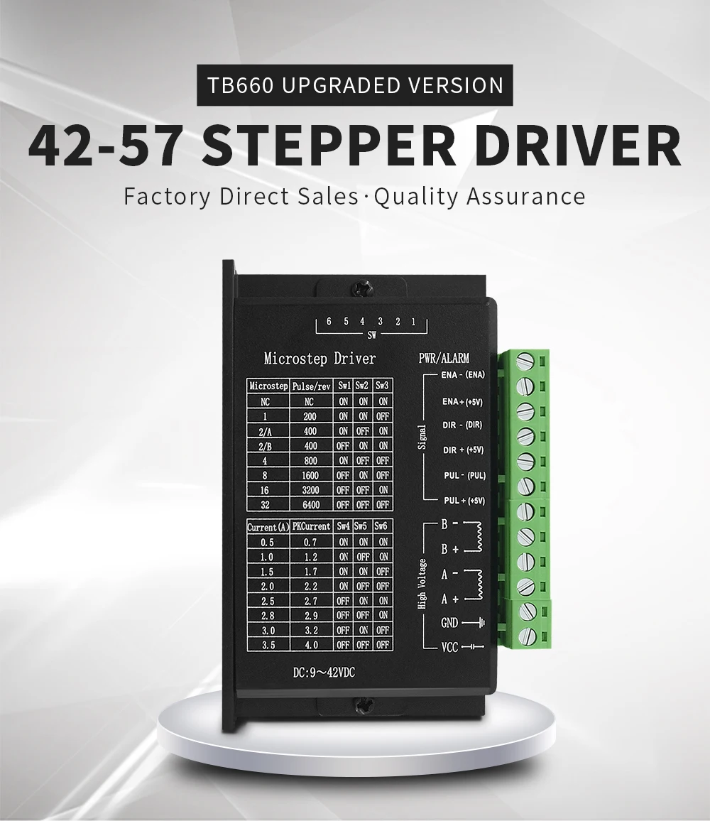 Модернизированная версия TB6600-это драйвер, подходящий для двухфазного гибридного шагового двигателя 57/42 с фазовым током ниже 4.0A.
