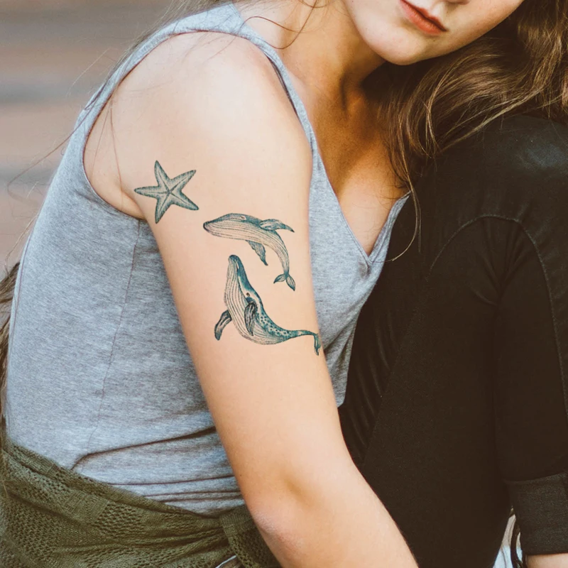 Синий океан татуировки с Китом наклейки красочные рыбы поддельные т...
