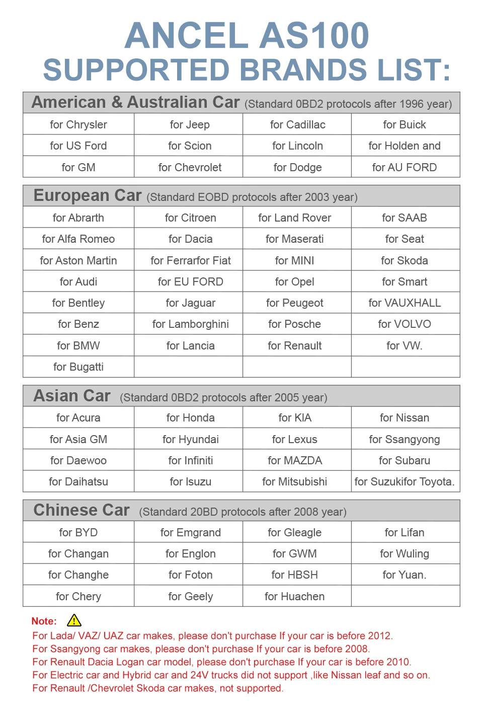 Американский (США) автомобиль:Совместимость со стандартными OBD2 автомобилями с 1996 года по настоящее время:Для Chrysler, для Ford, для GM, для JeepЕвропейский автомобиль:Совместимость со стандартными OBD2 автомобилями с 2003 года по настоящее время:Для Alfa Romeo, для SAAB, для Acura,Для Opel, для Audi, для сиденья,Для Bentley, для Skoda, для Daewoo,Для Benz, для Daihatsu, для Land Rover,Для BMW, для Vauxhall, для Volvo,Для VW, для Ford, для JaguarФранция автомобиль после 2006 года:Для Citroen, для Fiat, для Renault, для PeugeotНе поддерживает Renault Clio 2/Megane/Dacia Logan,Японский автомобиль:Совместимость со стандартными OBD2 автомобилями с 2005 года по настоящее время:Для KIA, для Isuzu, для Honda,Для Mitsubishi, для Hyundai, для Dacia,Для Lexus, для Mazda, для Nissan,Для Subaru, для Suzuki, для ToyotaКитайский автомобиль:Совместимость со стандартными OBD2 автомобилями с 2008 года по настоящее время:Для BYD, для Chery, для Geely,Для Great Wall, для KarryПримечание:Несмотря на то, что он совместим с большинством автомобилей, но различные регионы поддерживают протокол OBD2 транспортного средства в разное время, или некоторые машины имеют специальный дизайн, поэтому он может не совместим с некоторыми автомобилями, которые не поддерживают протокол OBD2. Особенно японский и корейский автомобильный бренд. И это устройство имеет только функции OBD2, не имеют специальных функций, таких как сброс ABS, сброс подушки безопасности...Пожалуйста, оставьте нам сообщение в формате ниже, мы ответим Вам в течение 8 часов.Например: xx, 2005, 2.0cc, дизельПримечание:Не поддерживает Российские Автомобили ВАЗ, УАЗ, Лада; Не работает с грузовикамиДля Ssangyong Actyon, с 2009 по 2017 год.Для Ssangyong Korando, 2,0 TD Diesel, с 2013 по 2017 год.Для Ssangyong Kyron, 2,0 Diesel, с 2010 по 2017 год.Для Ssangyong Rexton , 2011-2017 лет,Не поддерживает Opel Corsa c 2004 1,3 CDTIПоддержка vw golf 4 2002Ancel OBD2 сканер AS100 поддержка протокола:AS100 поддерживает полный двигатель OBDII/EOBD диагностические функции и поддерживает obd2 протоколы автомобиля, такие как:1.SAE J1850 PWM (41,6 кбод)2.SAE J1850 VPW (10,4 кбод)3.ISO9141-2(5 бод инициализации, 10,4 кбод)4.ISO14230-4 KWP(5 бод инициализации, 10,4 кбод)5.ISO14230-4 KWP (быстрая инициализация, 10,4 кбод)6.ISO15765-4 CAN(11 бит ID,500 кбод)7.ISO15765-4 CAN(29bit ID,500 кбод)8.ISO15765-4 CAN(11 бит ID,250 кбод)9.ISO15765-4 CAN(29 бит ID,250 кбод)