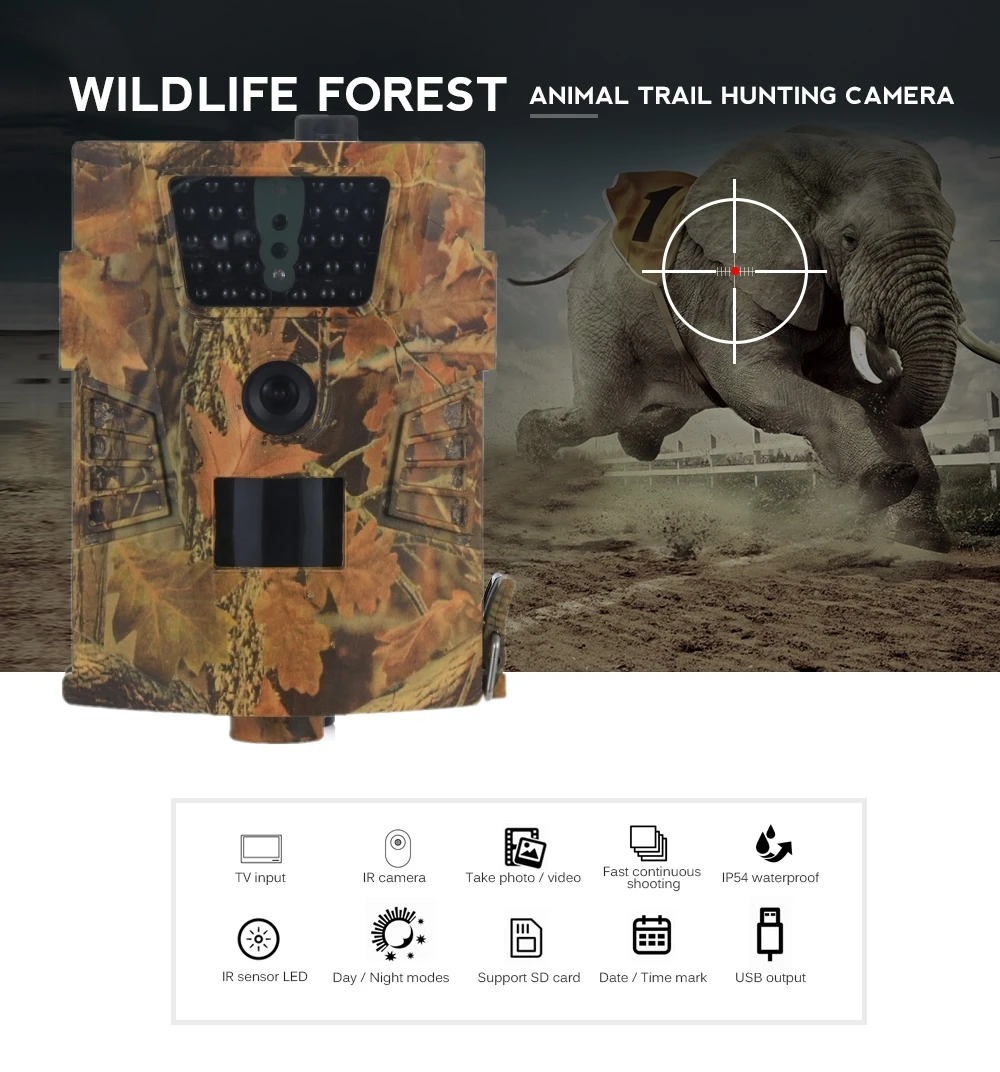 -Камера с инфракрасным датчиком 90 градусов, поддержка выбираемого разрешения изображения 12 МП/8 МП/5 МП, видео 1080P 30 кадров в секунду. Инфракрасная камера для наблюдения за дикими животными.-1 / 5/10/30 секунд/минут интервал между движениями по желанию. Камеру можно запрограммировать на работу в режиме PIR или в режиме замедленной съемки.-ИК-вспышка для цветного фото/видео днем или черно-белое фото/видео в ночное время. HD-видео со звуком.-Реальная температура, время и дата будут отпечатаны на изображении, чтобы вы знали, когда была сделана картинка или видео.-30 ИК-светодиодов, сверхбольшой диапазон обнаружения до 20 м/66 футов. Время запуска 1,1 С, быстрая непрерывная съемка, никогда не пропустите ни одной важной картинки.-Герметичный водонепроницаемый внешний вид IPX54, эффективно предотвращает попадание дождевой пыли и насекомых.-Поддержка карт Micro SD (до 32 Гб)/выхода USB / AV (SD-карта в комплект не входит).-Отличный инструмент для охоты, путешествий, кемпинга, отслеживания домашних/диких животных. Легко использовать и устанавливать.-Он может срабатывать при любом движении человека (или животных) в определенном регионе, контролируемом датчиком движения.-Инфракрасный пульт дистанционного управления является входным устройством камеры и в основном используется для настроек клиента. Максимальное дистанционное расстояние составляет 20 метров.-С фиксированной веревкой с пряжкой, легко закрепляется на деревянных стержнях и ветках дерева.Источник питания:1. 4 щелочные батареи AAС 4 щелочными батареями типа АА (не входят в комплект), самое длительное время ожидания до 3 месяцев, обратите внимание, что напряжение перезаряжаемых батарей типа АА (1,2 в) недостаточно для питания этого устройства.2. Солнечная панельОригинальные солнечные панели на литиевой батарее 6 в на выбор.3. Адаптер питанияЭта камера также может питаться от внешнего адаптера постоянного тока 6 в.