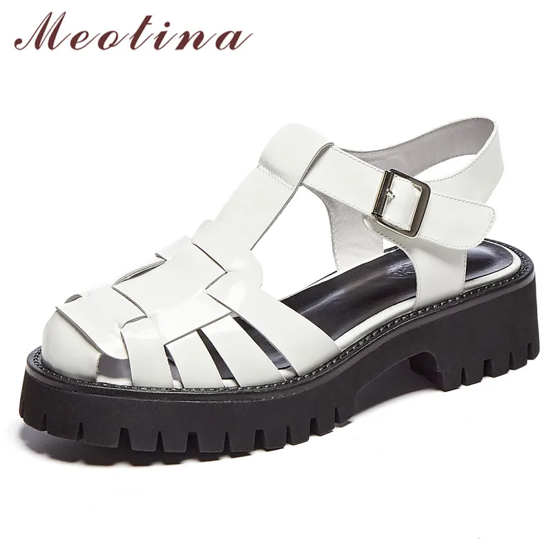 Женские босоножки на танкетке Meotina, черные босоножки на среднем каблуке, с Т-образным носком и пряжкой, лето сандалии из натуральной кожи