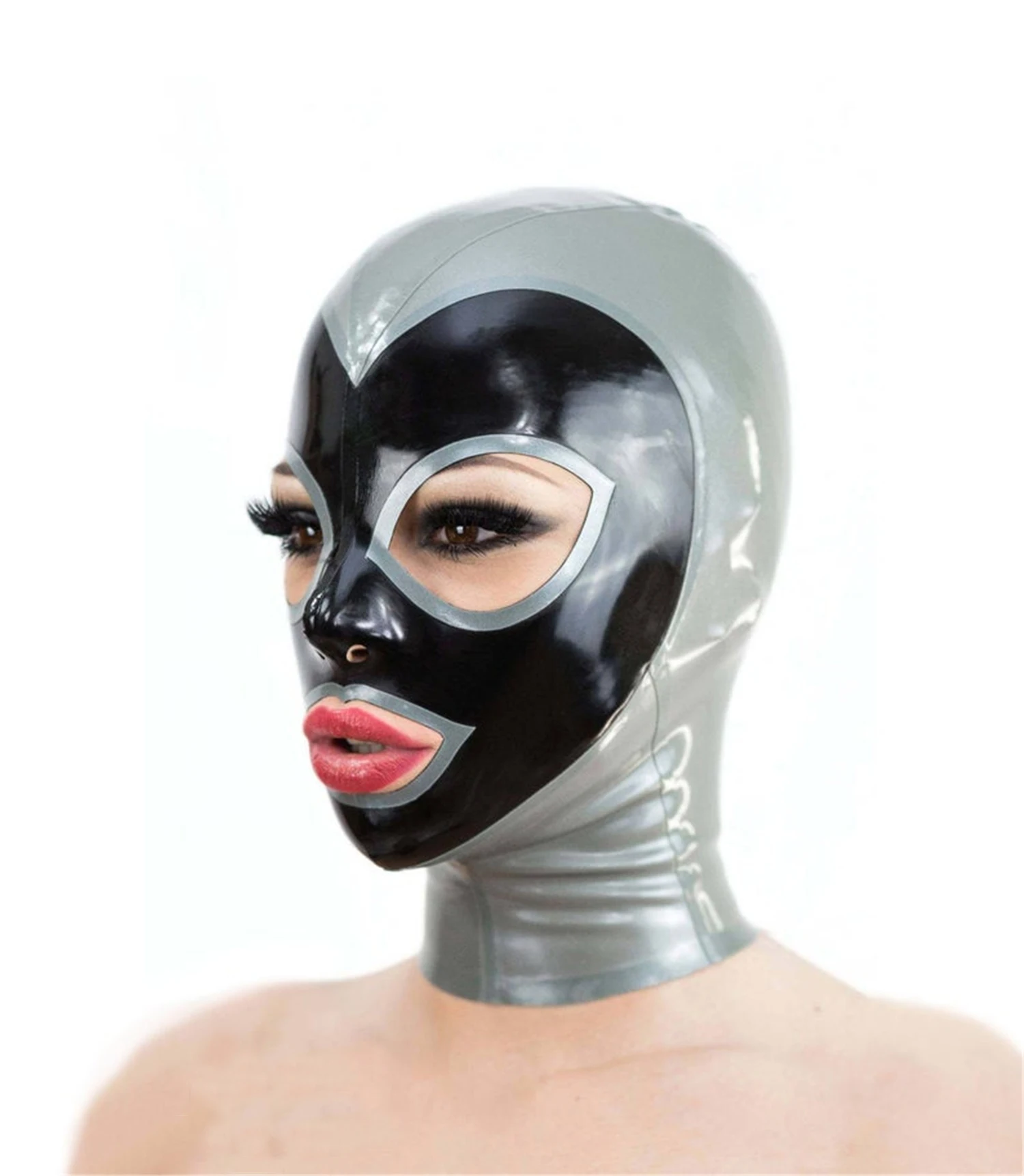 Новый дизайн сексуальное экзотическое Клубное нижнее белье ручной работы серебристый с черным латексом милые открытые глаза и рот молния сзади cekc костюм капюшон фетиш