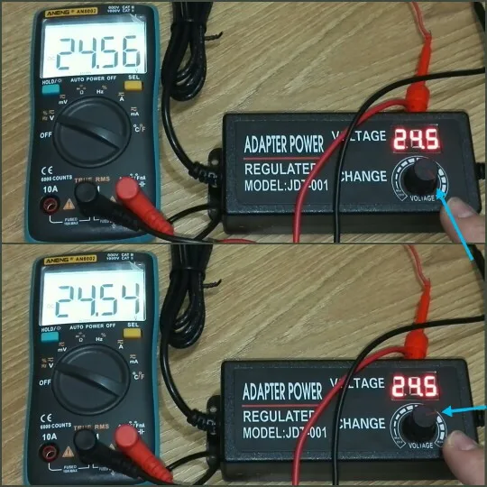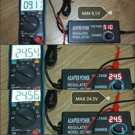 Товар соответствует описанию. Он прибыл в Испанию в течение трех недель, красиво упакован в картонную коробку. Этот источник питания переменного тока (модель JDT.001) обеспечивает напряжение 9,1 в до 24,5 в с максимальной интенсивностью 3 А. В виду, максимум 72 Вт. Я попробую это в будущем с помощью своих электронных проектов. Поставляется с разъемом европейского стандарта. Он подключается к сети 220 в, а выход постоянного тока-через разъем 5,5*2,1. С помощью вашего потенциометра и вашего дисплея с вольтметром, мы можем выбрать желаемое выходное напряжение. Потенциометр имеет функцию включения/выключения и его Регулировка является гладкой с одним поворотом. На самом деле, последняя часть тура не изменяет конечное выходное напряжение. Возможно, было бы лучше использовать еще одно менее чувствительное значение потенциометра, так как диапазон 9-24 В повышен, а Тур потенциометра несколько короткий. Все же, это довольно точно при выборе выходного напряжения во всем диапазоне (9-24 В). Я проверил с помощью вольтметра в «пустой», без каких-либо нагрузки.