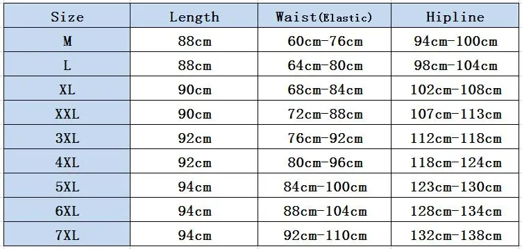 M: Длина: 88 см талия: 60-76 см обхват бедер: 94-100 см L: Длина: 88 см обхват талии: 64-80 см обхват бедер: 98-104 см XL: длина: 90 см обхват талии: 68-84 см обхват бедер: 102-108 см XXL: длина: 90 см талия: 72-88 см обхват бедер: 107-113 см 3XL: длина: 92 см талия: 76-92 см обхват бедер: 112-118 см 4XL: длина: 92 см талия: 80-96 см обхват бедер: 118-124 см 5XL: длина: 94 см Талия: 84-100 см обхват бедер: 123-130 см 6XL: длина: 94 см Талия: 88-104 см обхват бедер: 128-134 см 7XL: длина: 94 см обхват талии: 92-110 см обхват бедер: 132-138 см