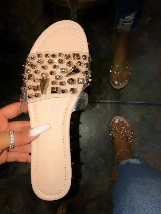 Шлепанцы Стразы с заклепками для женщин, Уличная обувь, пляжные сандалии на плоской подошве, повседневные домашние тапочки со змеиным узором и открытым носком