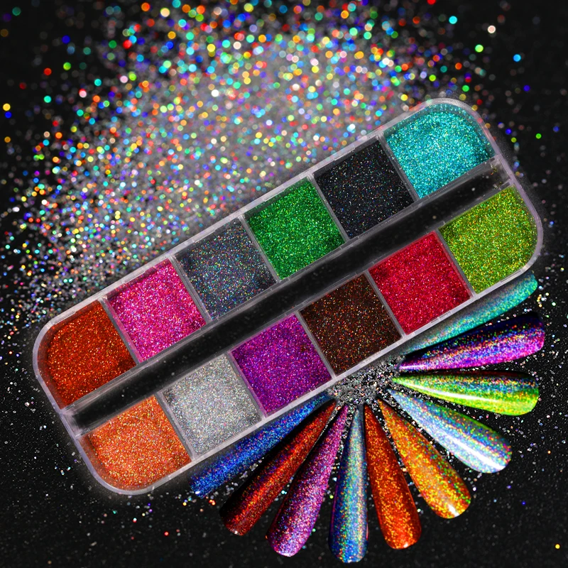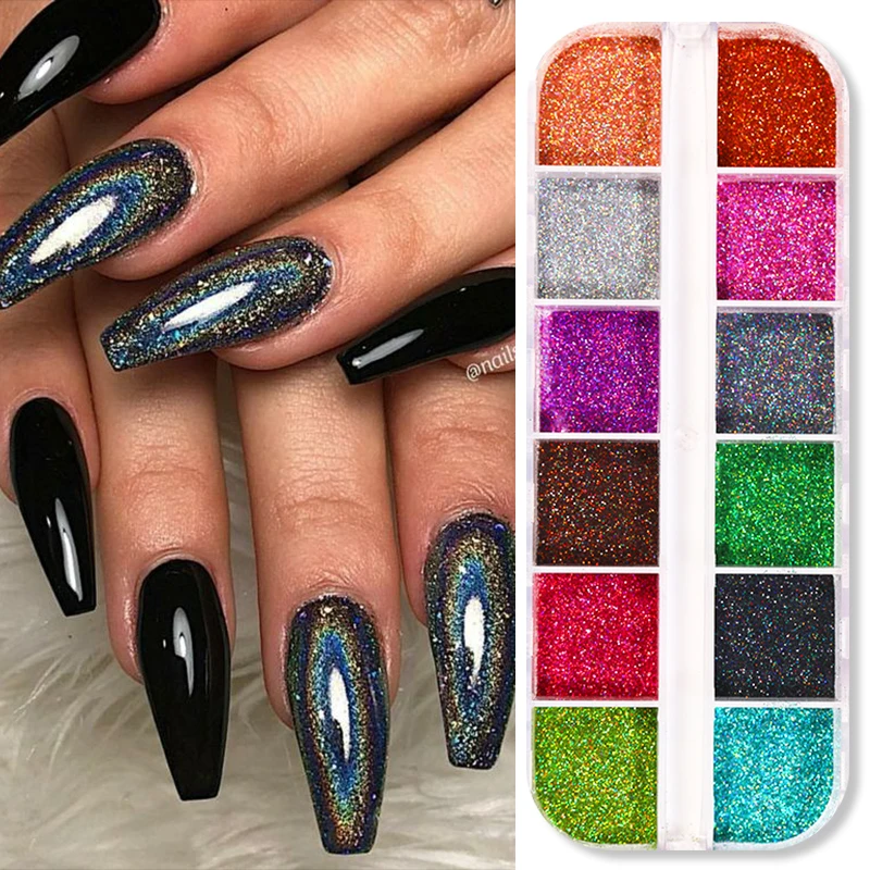 Переливающаяся пудра для ногтей, 12 ячеек, хромированная пудра для дизайна ногтей, пудра для дизайна ногтей с погружением в воду, блестящий яркий пигмент, блеск