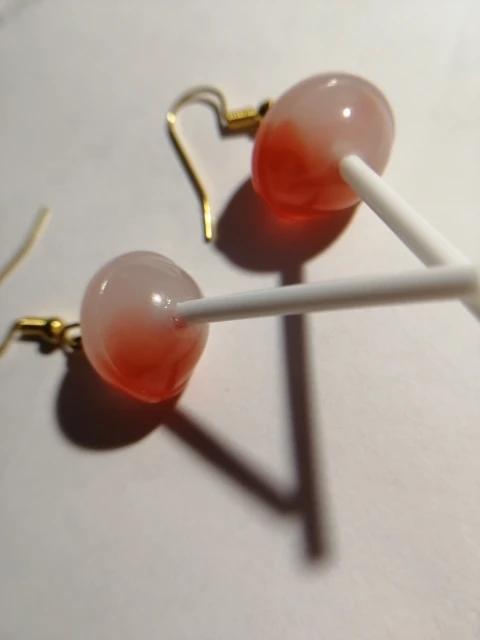 Швензы заметно желтушного цвета. Одна серёжка прям идеальная, другая со следами клея у основания и тремя царапитами на самой "карамельке". Конфета имеет овальную, чуть вытянутую форму. Можно попробовать заказать 2 пары, возможно подберется идеальная пара