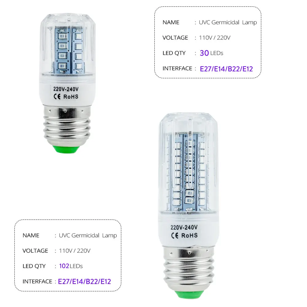 * С формой кукурузы, он может излучать светильник, который является более эффективным * Есть интерфейс E14, E27, E12,B22,E26 5 и 102 светодиода, 30 светодиодных ламп на выбор * Установите эту бактерицидную лампу UVC в своей комнате, чтобы вы могли без бактерий * Использование более 1 часа может эффективно убить 99.99% E. coli, Proteus, Staphylococcus aureus, Staphylococcus aureus и Bacillus subtilis. * Клещи: кровати, диваны, одеяла, подушки и полотенца больше не делают кожу зудящей и красной. * Убивает бактерии, бактерии: убивает плесень, грибок, E. coli и т. Д. * Удаление запахов: удаление невыносимых запахов из мусорных банок, туалетов, кухонь, холодильников, шкафов, обувных шкафов, складов и т. д. * Зеленый и эффективный, чистый физический метод стерилизации, Отсутствие вторичного загрязнения. * Мощная бактерицидная лампа, широко используемая в домах, больницах, магазинах, школах, ресторанах... * После использования бактерицидной лампы UVC будет запах солнечного света.