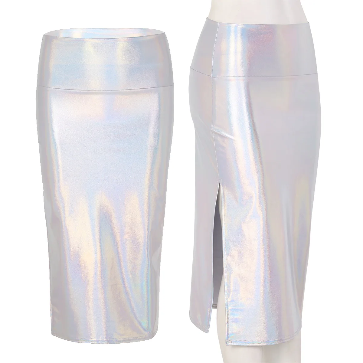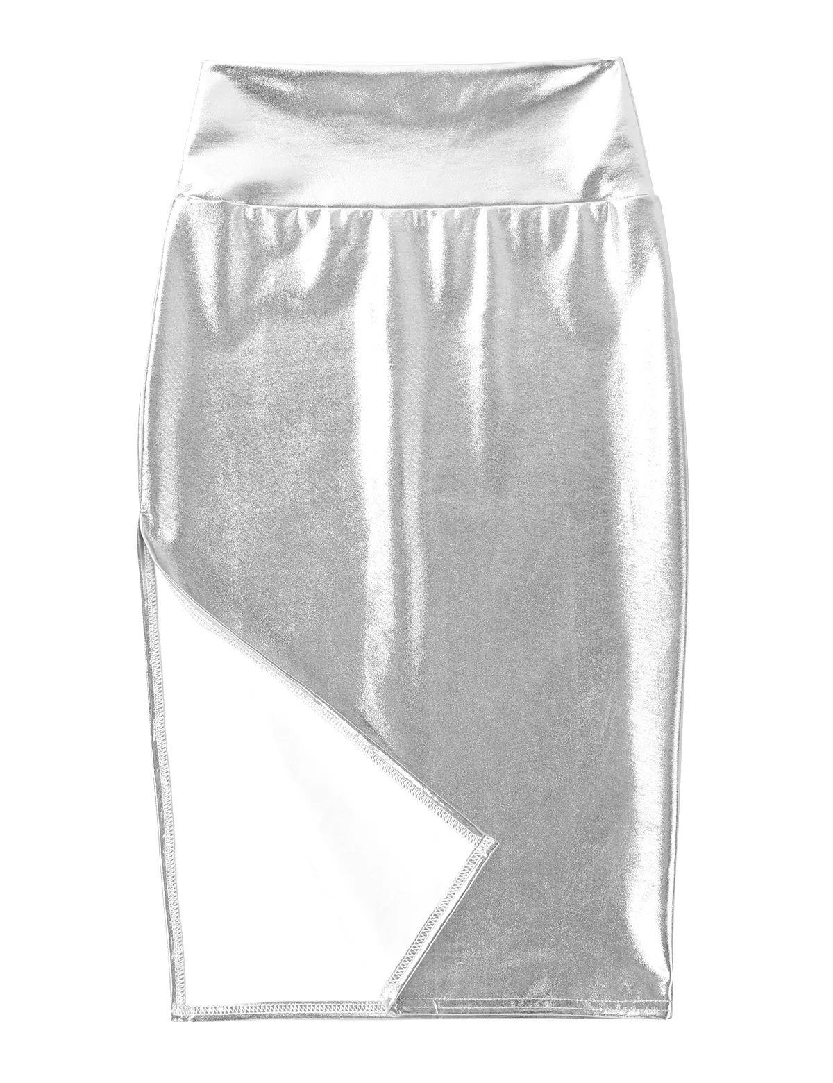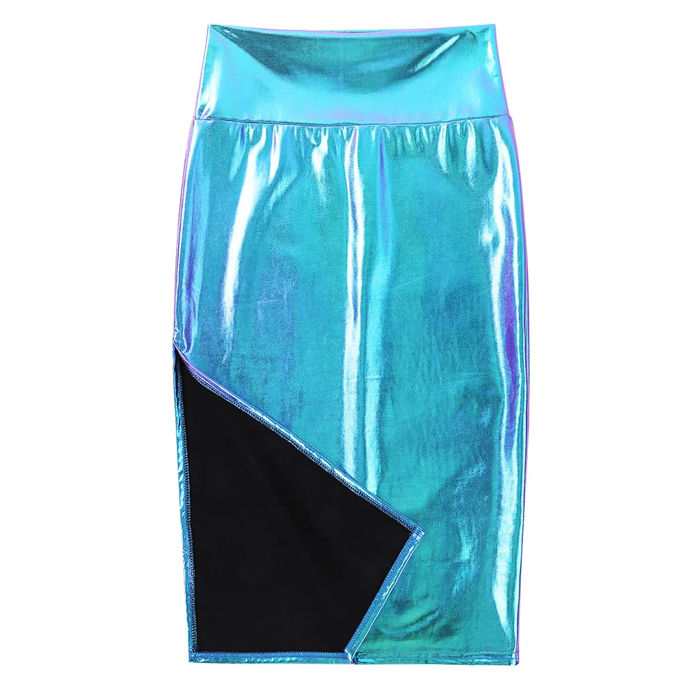 Женская модная блестящая металлическая облегающая юбка-карандаш средней длины.