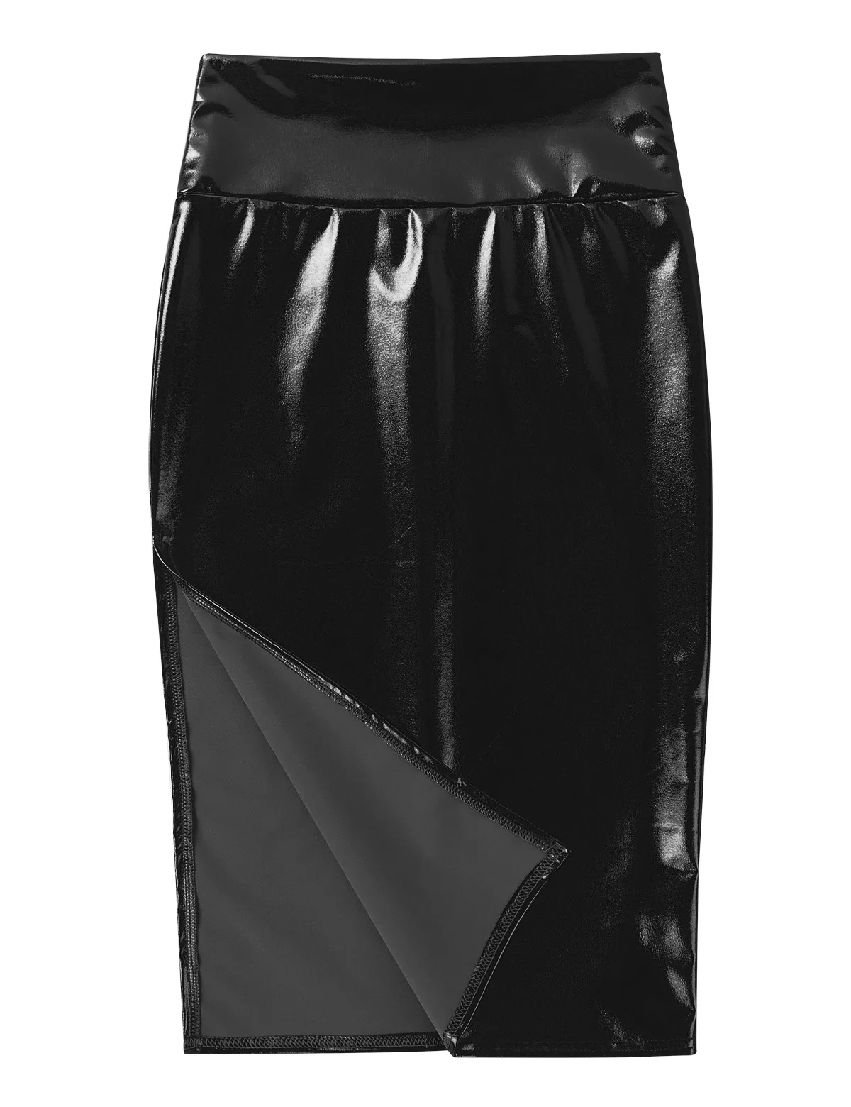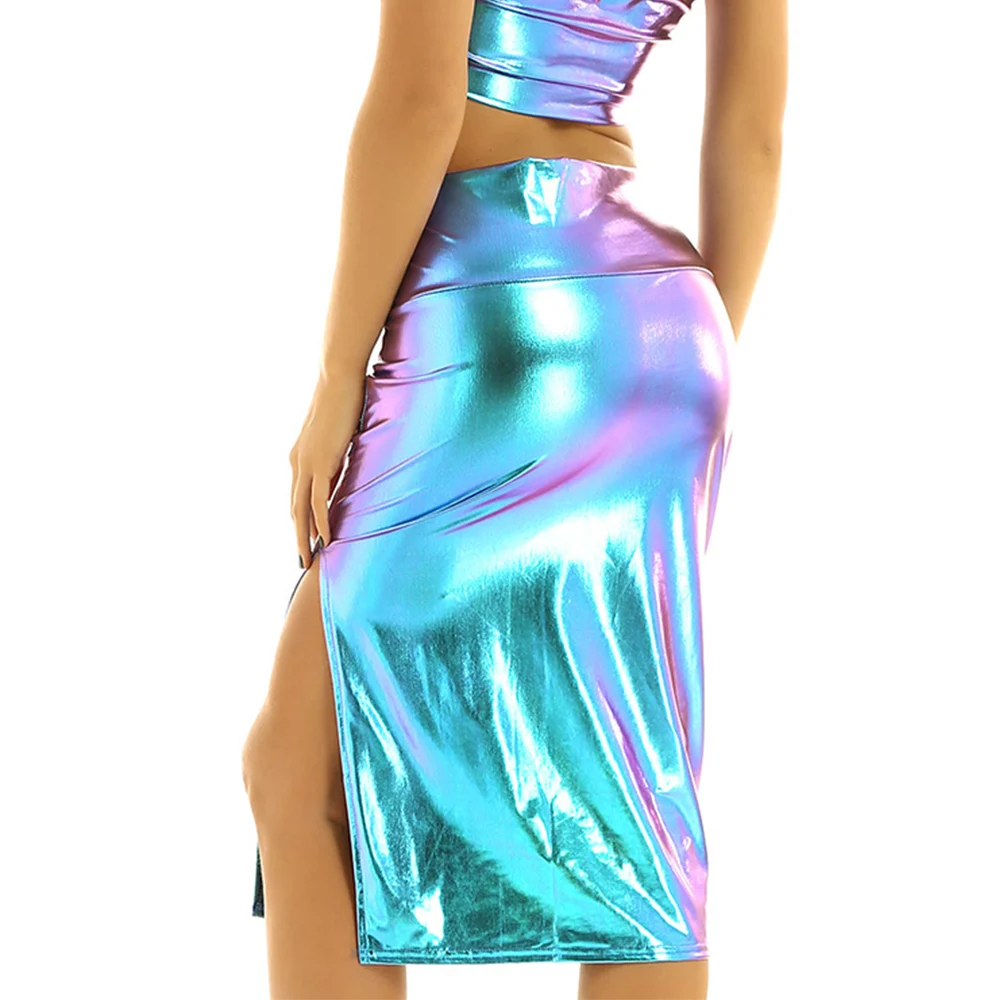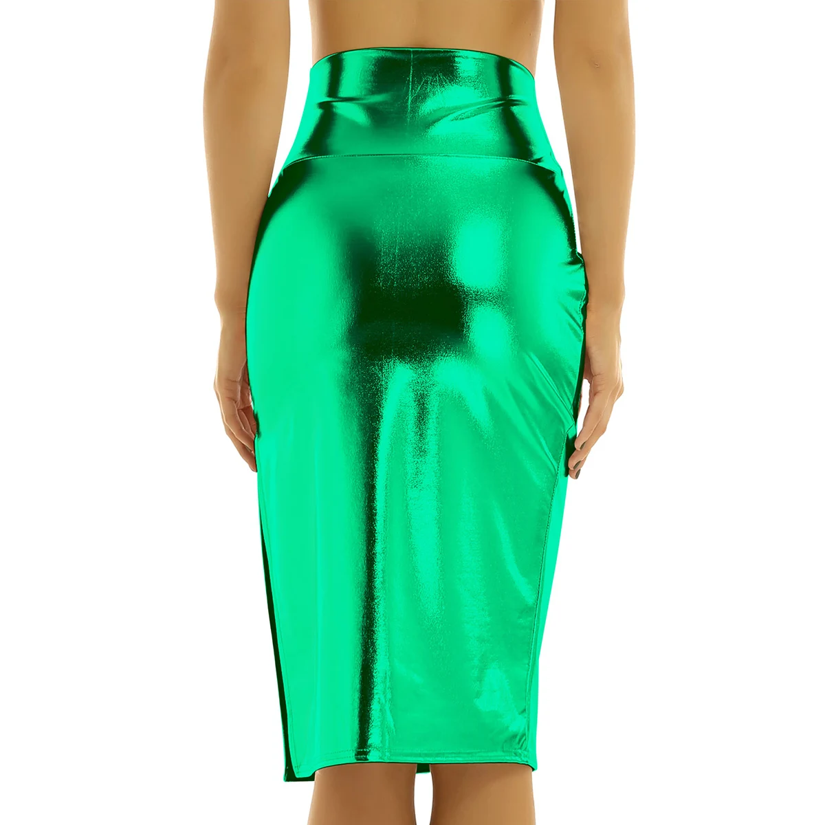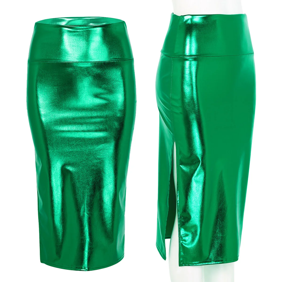Женская модная блестящая металлическая облегающая юбка-карандаш средней длины.