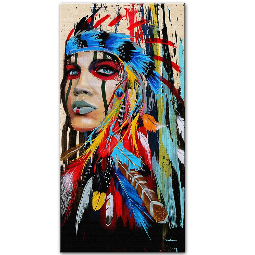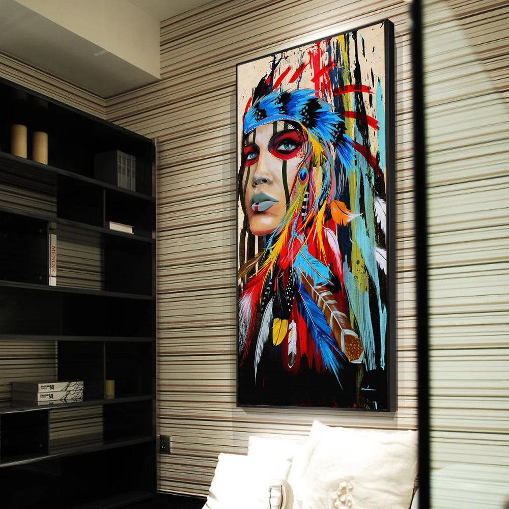 Акварельная индийская женщина с перьями, картины на холсте, поп-арт...