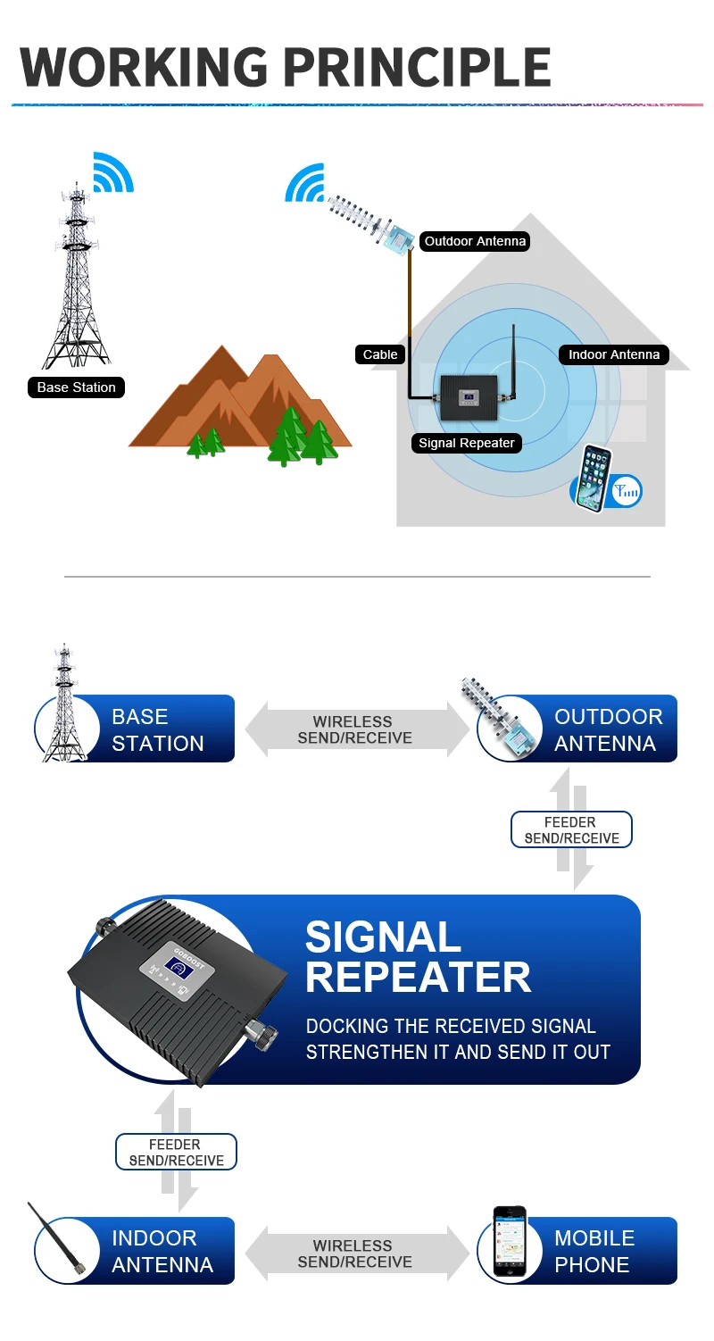 Высокие горы, здания или бетонные стены барьеры сигнал отправляется с базовой станции, потому что нет сигнала внутри комнаты.Установите наружную антенну на высоком месте, чтобы поймать great signal→ кабель передаст catched сигнал на устройство→ Усилитель сигнала усиливает сигнал → Внутренняя антенна передает усиленный сигнал→ Состояние сигнала внутри помещения становится хорошим