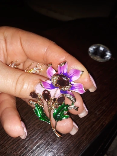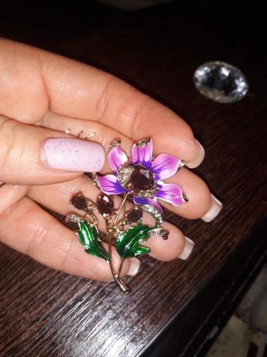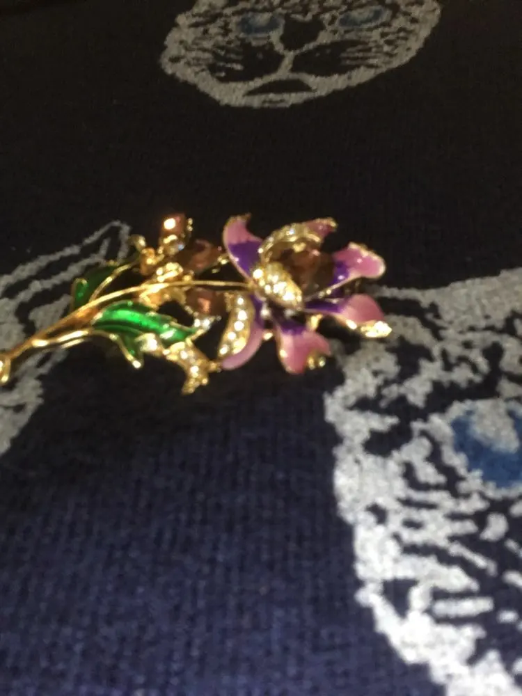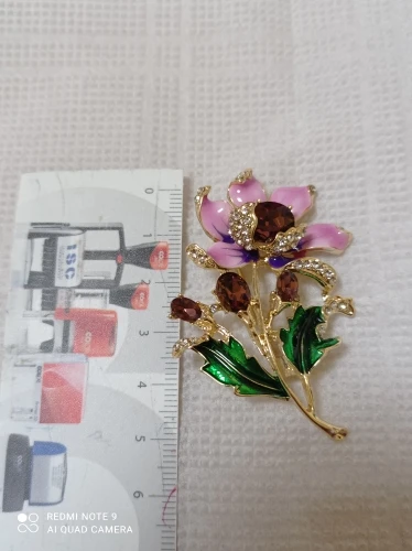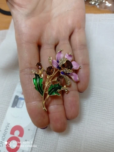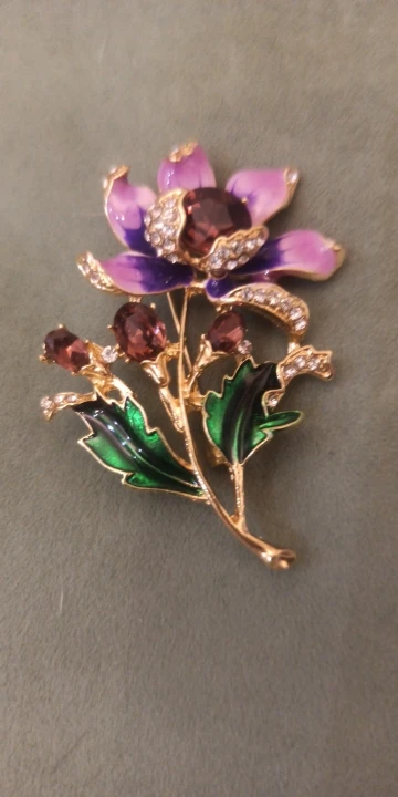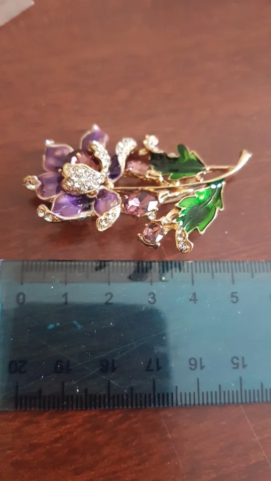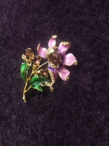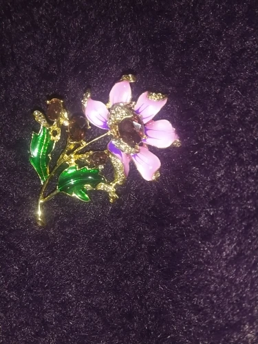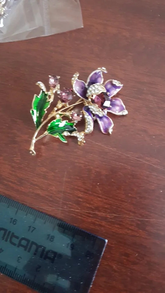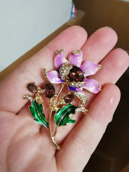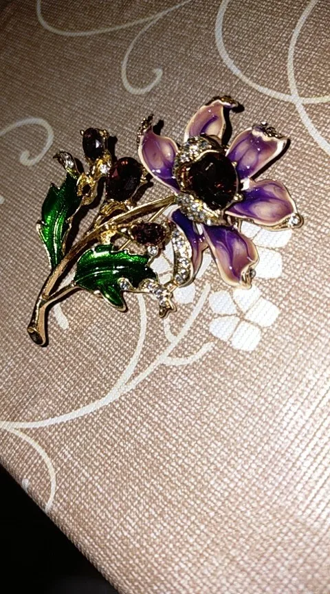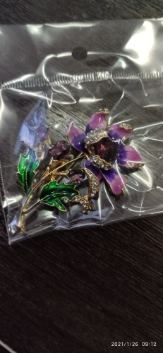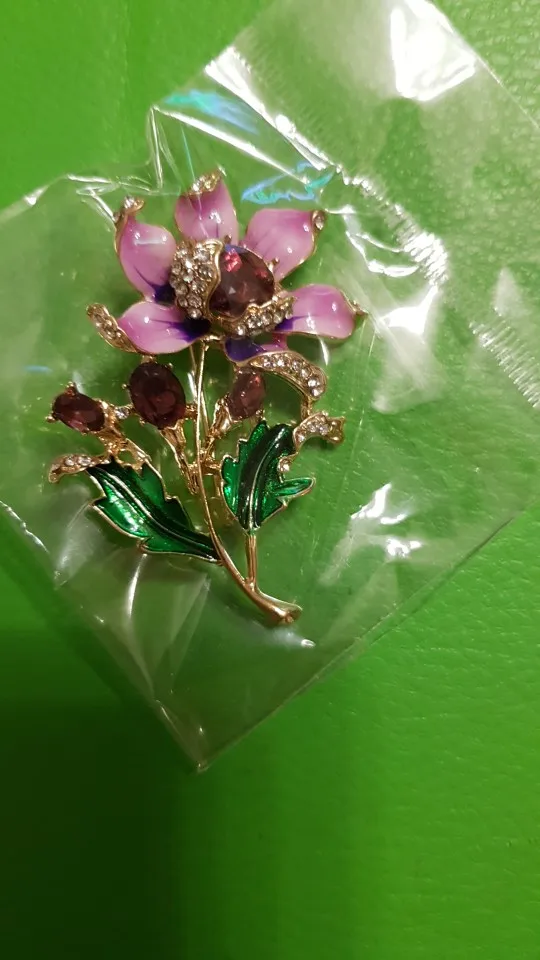Чудесный цветок. Застёжка булавочка и можно носить как кулон- есть петелькп для этого. Эмпль качемтвенно нанесена. Все камешки на месте. Мне понравились все брошки. Они качественные, блестючие. Продавца рекомендую. Не могла удкожаться, набрала кучу Описание точное, с продавцом не общались. Посылка пришла с набором других брошек. Шла долго, но думаю, это из-за пандемии+ перед Новым годом. Спасибо