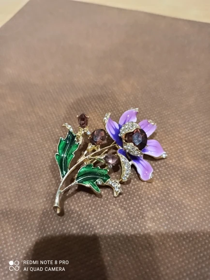 Брошь соответствует описанию. Пришла в сборной посылке довольно быстро. Цветок эмалью покрыт неравномерно, имеются разводы и не прокрашены места ( за это сняла одну звезду)
