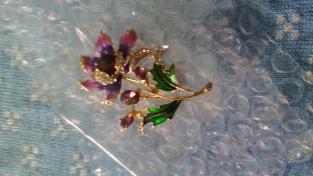 Брошка замечательная, как на картинке. Камушки все на месте, застёжка, кажется качественной, есть петелька для ношения, как кулон, на цепочке. Посылка пришла немного с опозданием из-за новогодних праздников. В одну посылку сложили четыре. Брошка была в пупырчатой пленке.