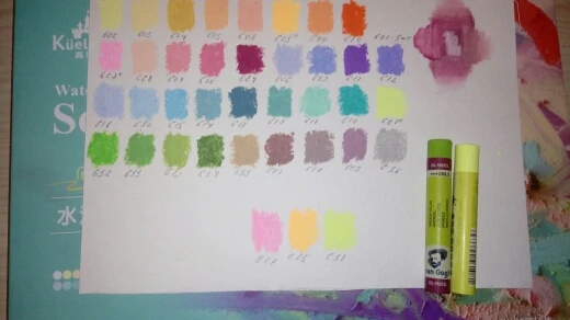 Пастель отличная. Размер как у ван Гога. Мягкость как у мунгё. Укрывистая. Брала набор 36+2 (получилось 3 белых мелка в наборе). Хорошие оттенки, все разбелённые, мягкие. Есть 3 неоновых цвета-похржи на текстовыделители. Цвета редкие, как дополнительный набор пастели, справляется отлично. Размывается водой. Пастель оставляет липкий след в работе.