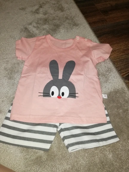 тоненький костюмчик на лето...зайчик неравномерного цвета( не очень качественная наклейка), швы ровные, немного торчат нитки-не критично.