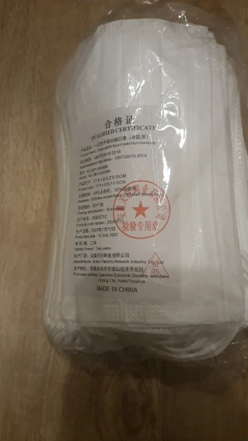 Продавец отличный, маски пришли за 9 дней. Качество на мой субъективный взгляд адекватное, маска средне - плотная, как в аптеке, на лице лежит хорошо, резинки приклеены весьма добротно, металлическая вставка для крепления на носу имеется. Какого-то сверх неприятного запаха не обнаружено. Маски советую)