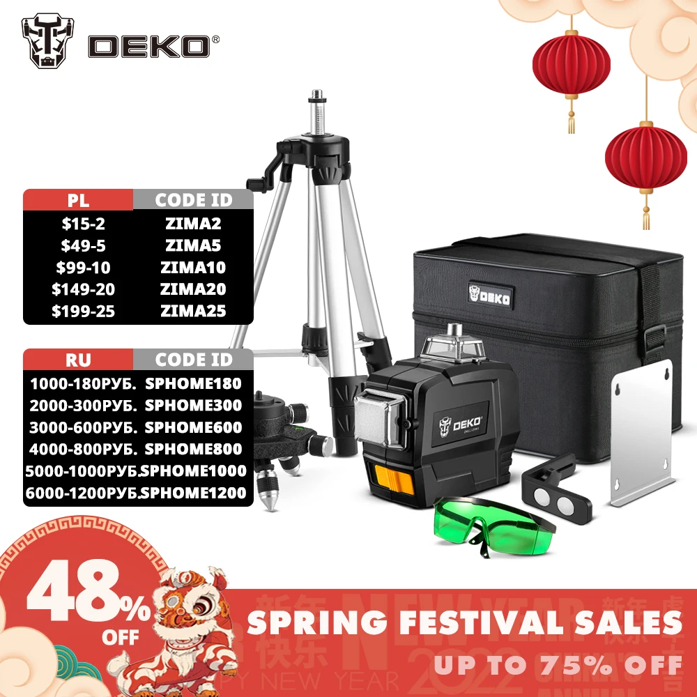 Лазерный уровень DEKO DKLL12PB, 12 линий, 3D, самонивелирующийся, вертикальный, горизонтальный, 360 градусов, поворотный, для использования в помещении и на улице