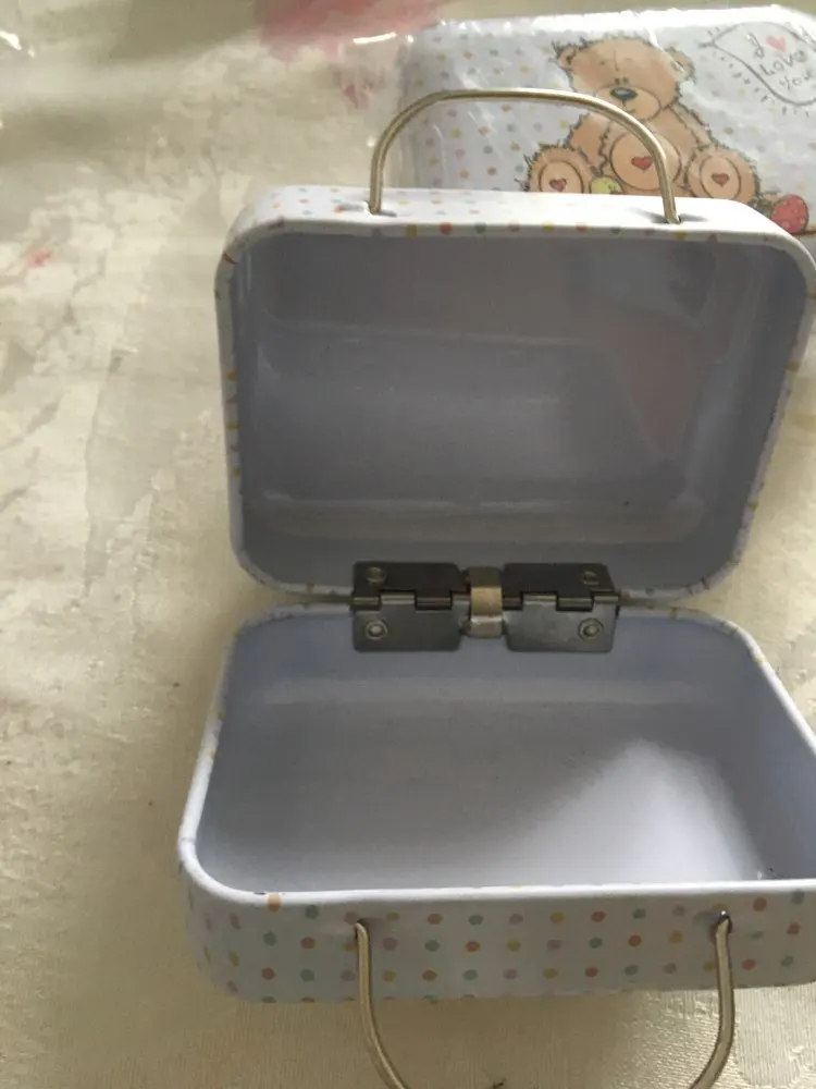 Чемоданчик классный, жестяной. Ручки поднимаются/опускаются. Внутри однотонный