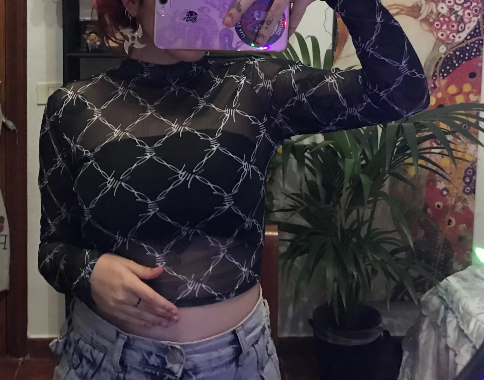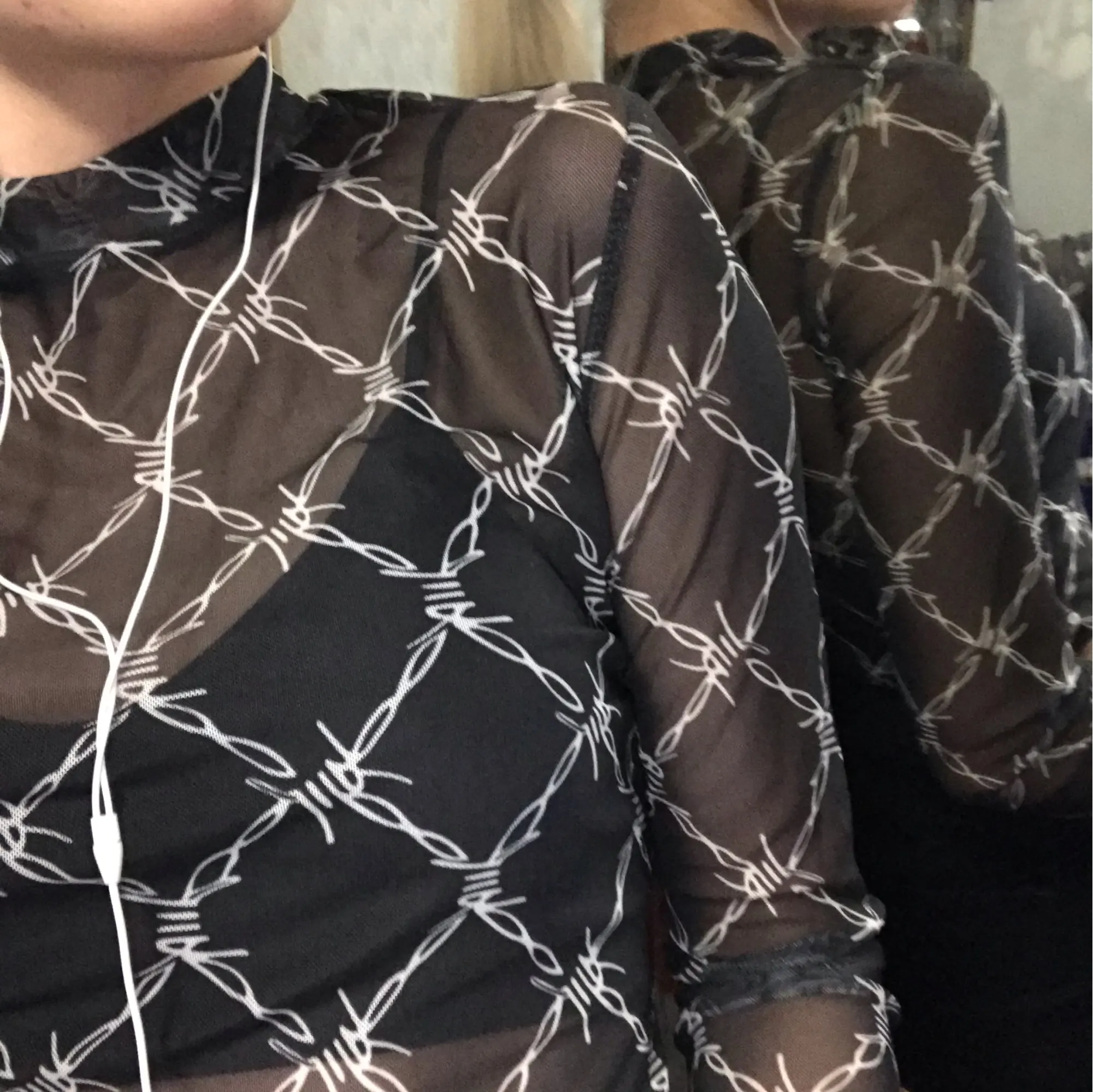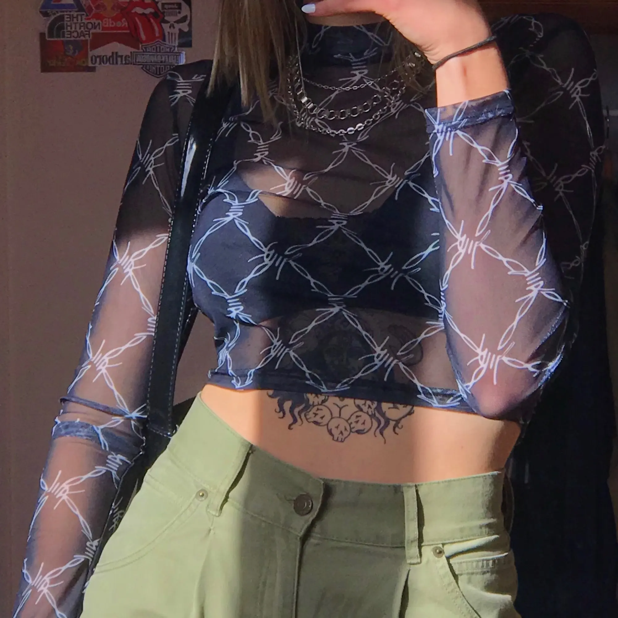Сетчатая футболка, женский сексуальный укороченный Топ с длинным рукавом, футболка с принтом цепей, женская уличная одежда, винтажный ажурный топ, Новое поступление 2020