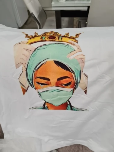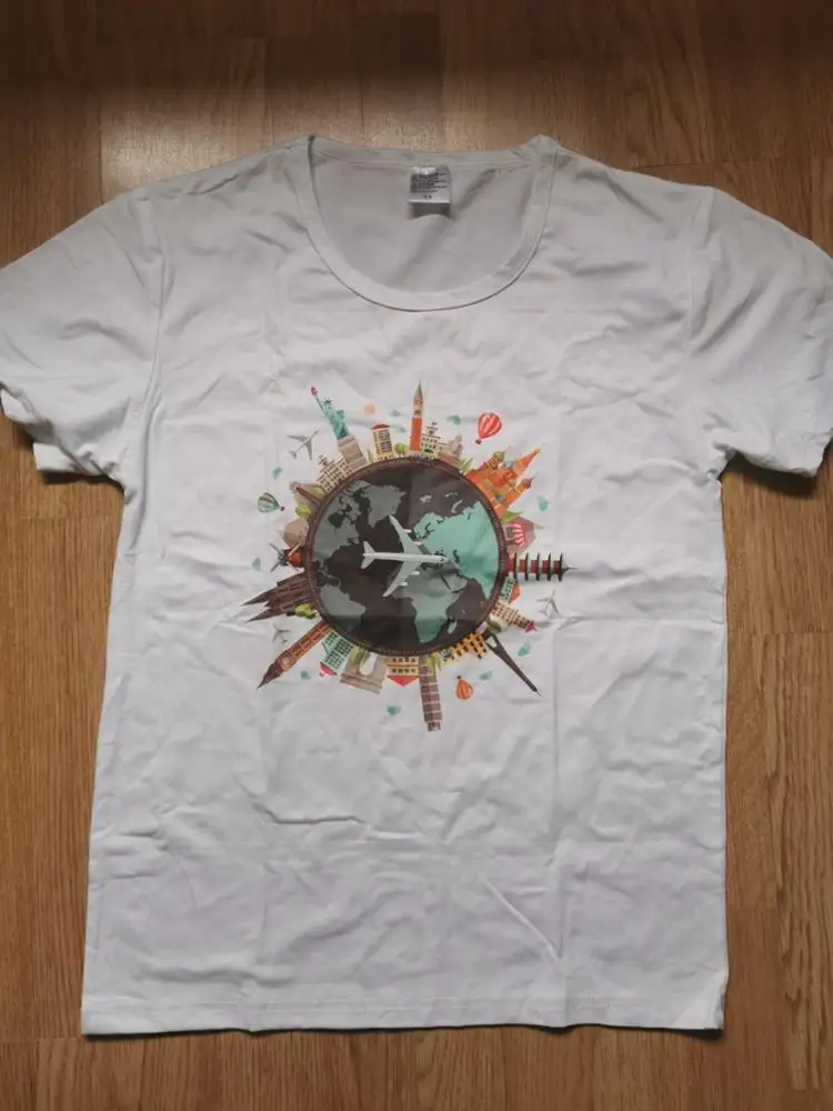 Хорошая ткань, но рисунок меньше, чем на картинке, и цвета не такие яркие Все в хорошей футболке, и я доволен этим.