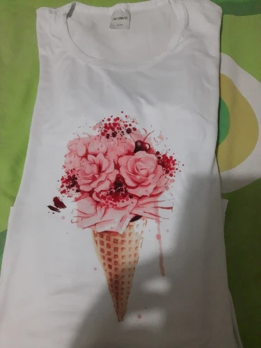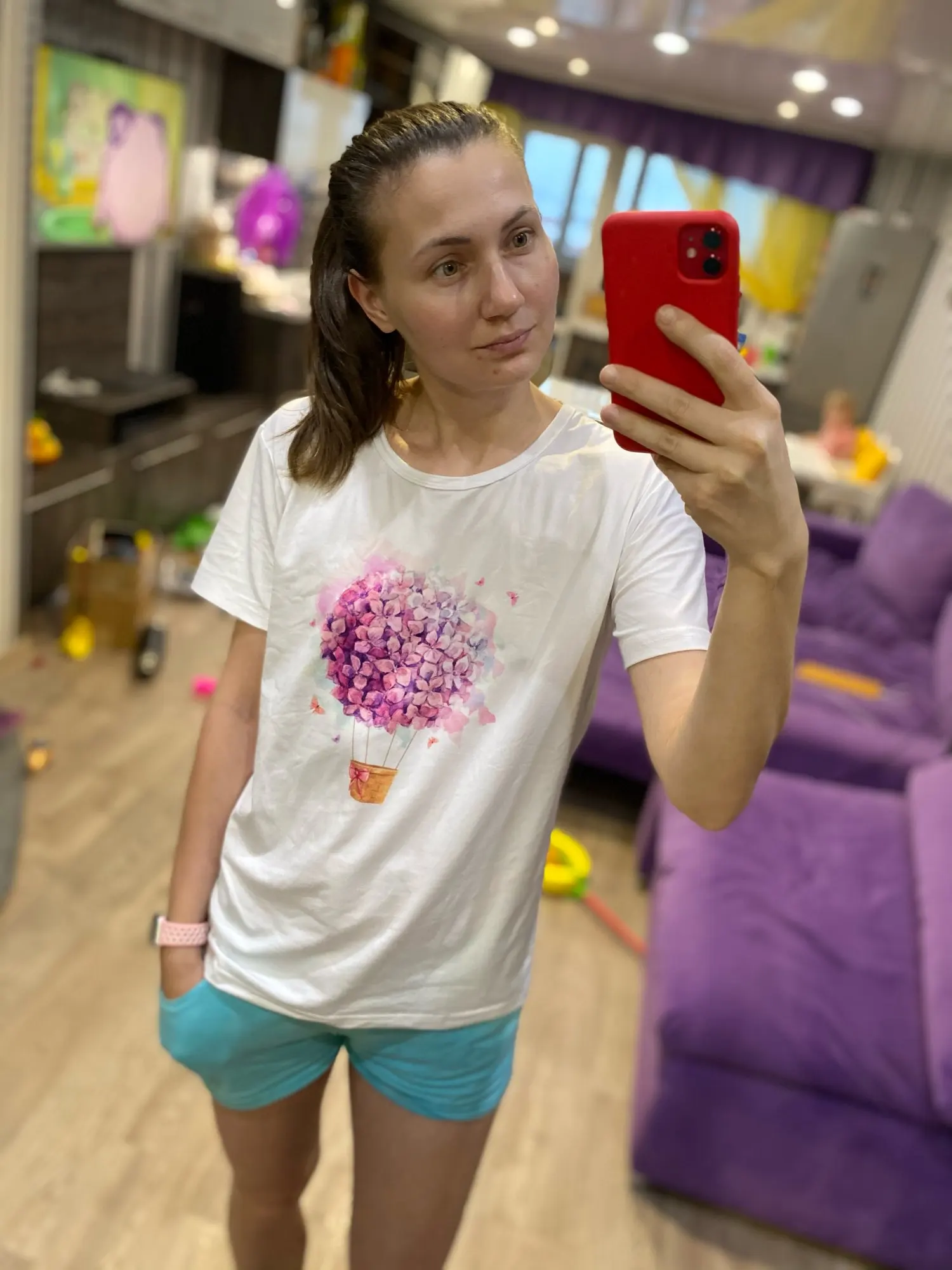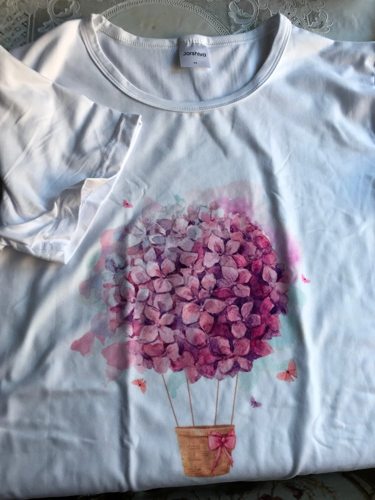 Принт на футболке в реальности меньше,чем на картинке и цветы не такие синие, а больше серо-зеленые. Это расстроило. Ткань футболки приятная, сшита хорошо. Размер S сел довольно свободно.