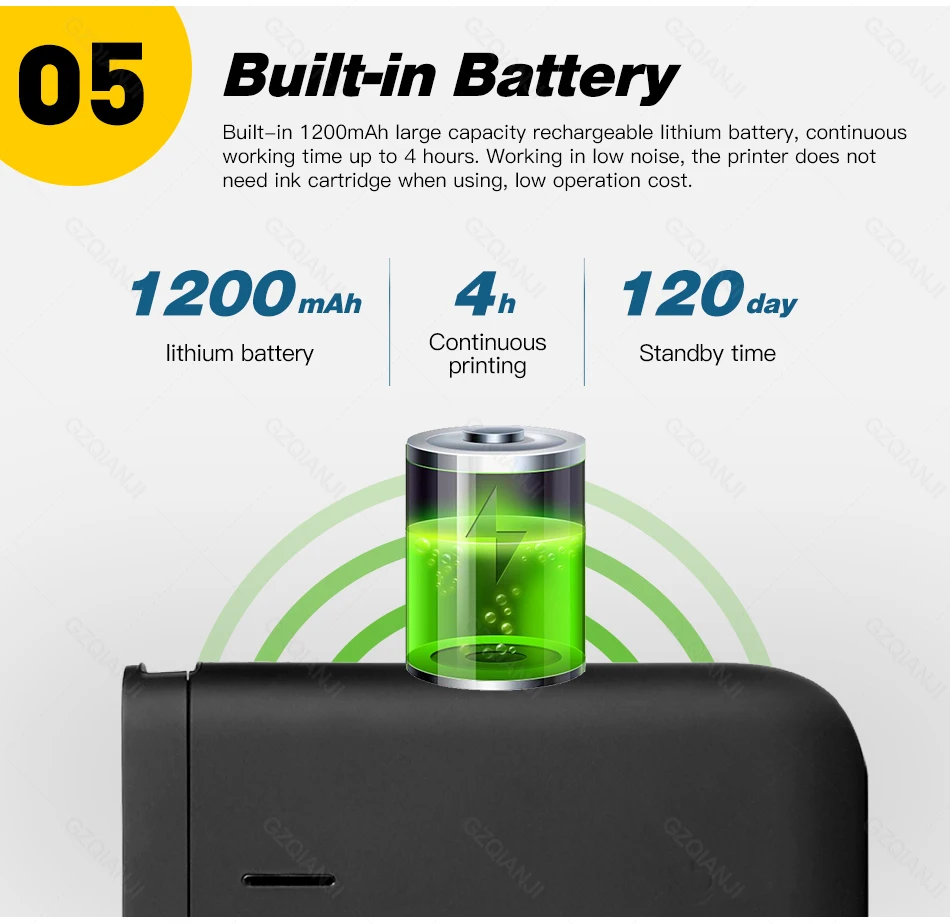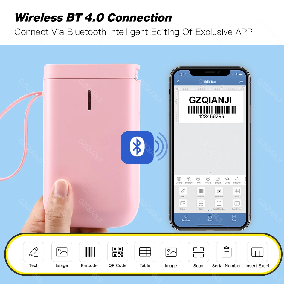 Беспроводной дизайн, поддерживает печать на большие расстояния.Беспроводное расстояние до 10 м.Прямой тепловой, без чернил, тонера или лент.Поддерживает все основные форматы этикеток: цена, дата, размер, вес, имя и т. д.Универсальный, простой в использовании.Компактный и легкий, удобный для переноски.Аккумулятор емкостью 1200 мАч поддерживает длительное использование.Характеристики: