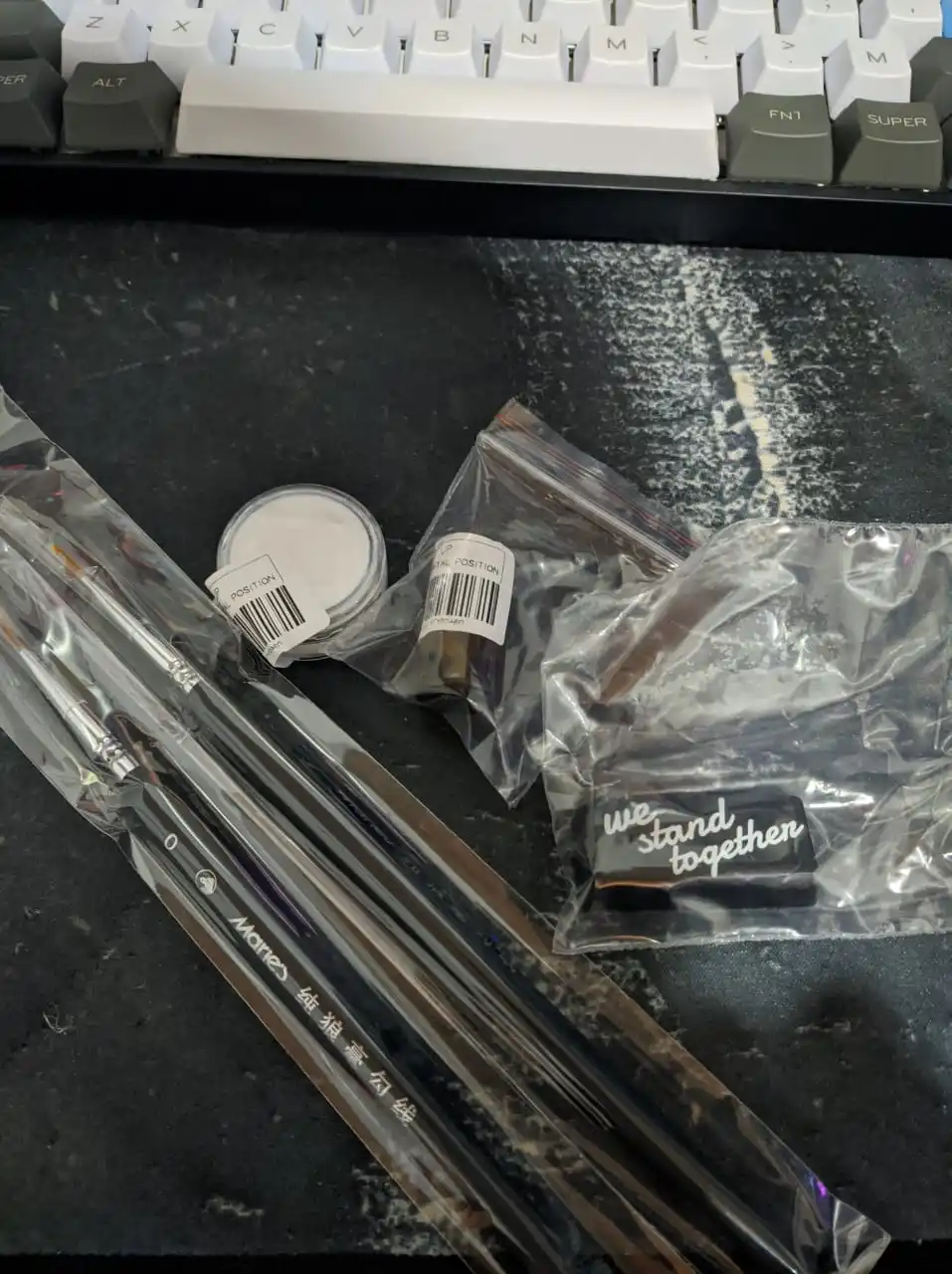 Продавцу 10 звезд за упаковку. В картонной коробке, все в отдельных пакетиках. Плюс крышки проклеены стикерами, чтобы не открылись случайно. Смазка и масло нормальные. Линейные свичи можно смазывать g205, a пружины маслом g105. Кисточки не супер, но на один раз пойдет.