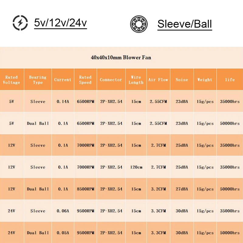DC 5V/12V/24V опционально, подшипник рукава и шариковый подшипник опционально, 2pin соединение