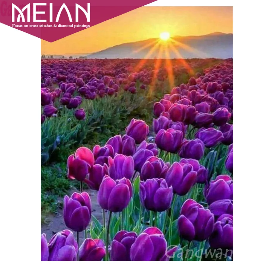 2020 Алмазная картина Meian с цветами, фиолетовые тюльпаны, вышивка, натуральные картины стразы, полный набор, искусственные наборы