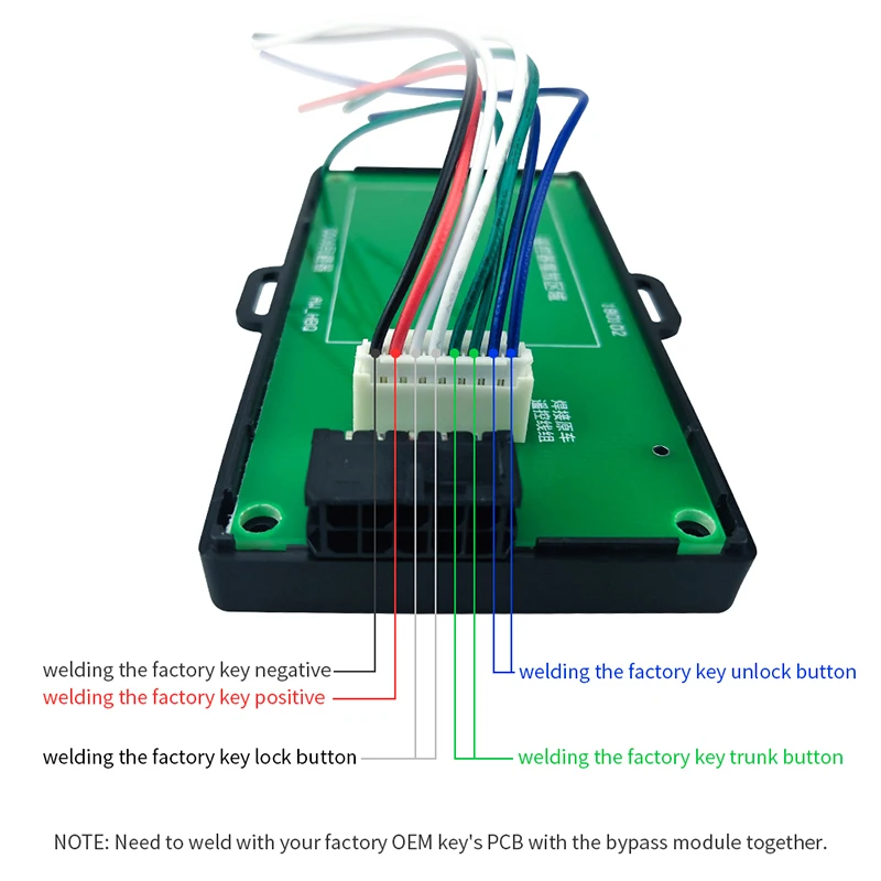 Если в вашем заводском OEM брелоке есть иммобилайзер чипа, требуется дополнительный ключ, и вам нужно вынуть заводскую печатную плату брелока и припаять его с модулем байпаса в этом комплекте.