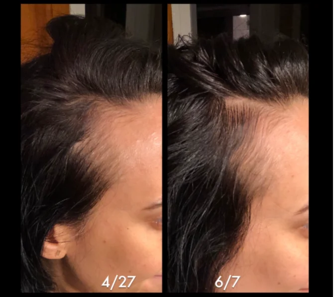 После родов я потеряла много волос, и спереди у меня очень тонкая область. Я купил это и следовал инструкциям. В течение недели мои волосы перестали расти, и теперь некоторые волосы вокруг линии волос растут назад. Нравится эта вещь, определенно рекомендую