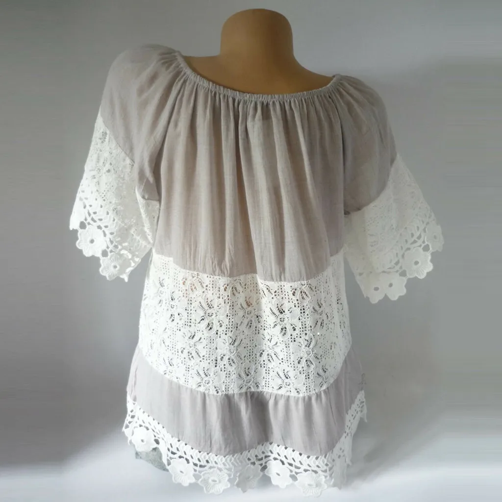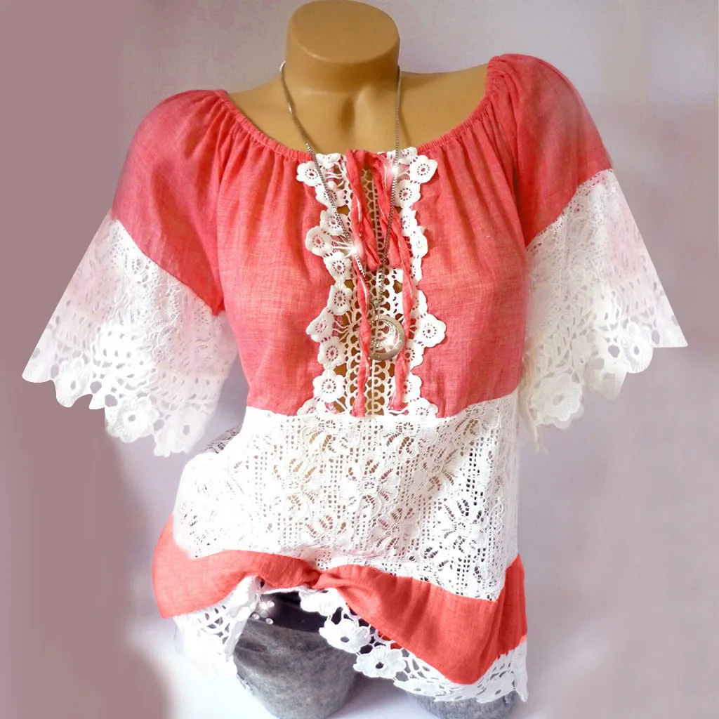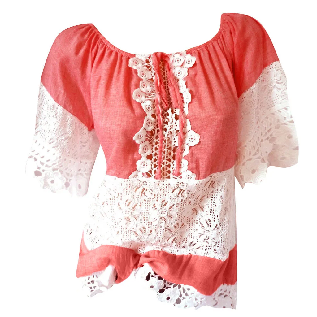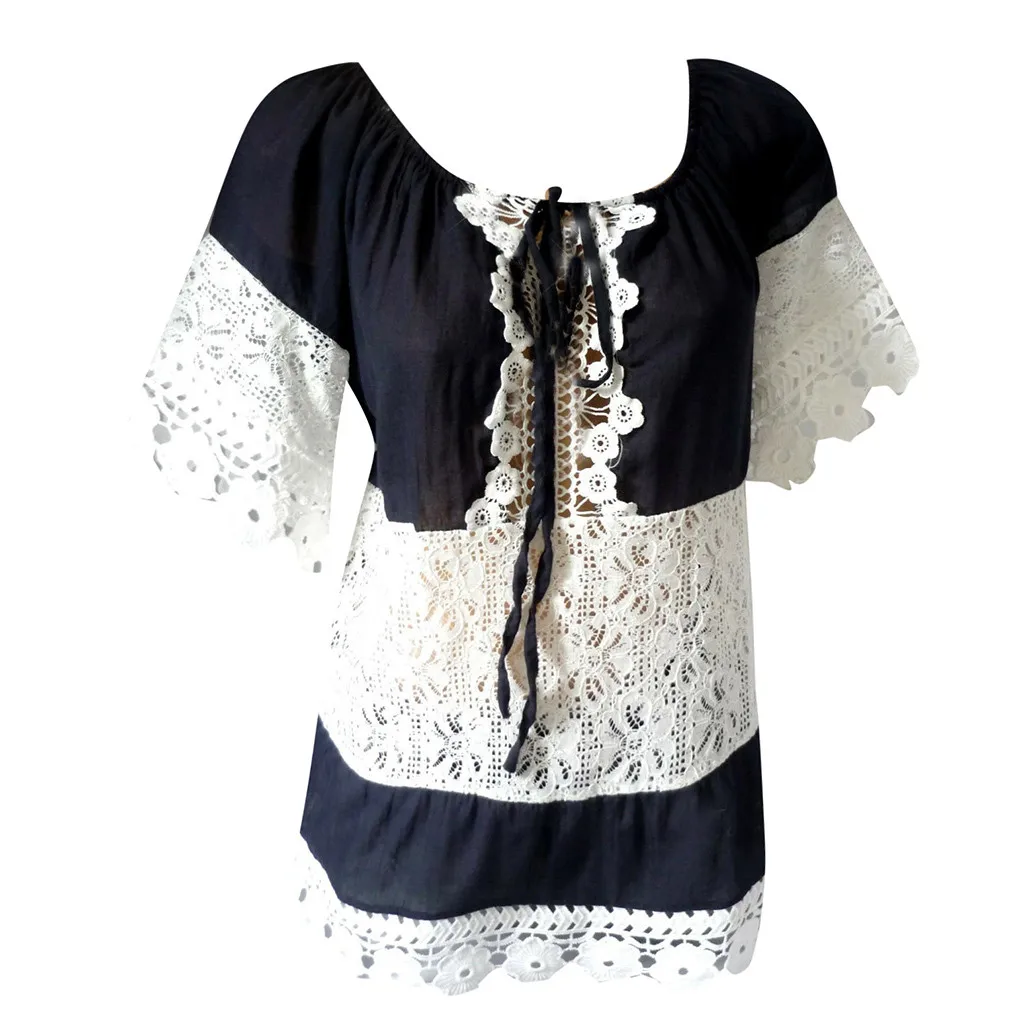 Женские летние повседневные кружевные лоскутные Топы с коротким рукавом