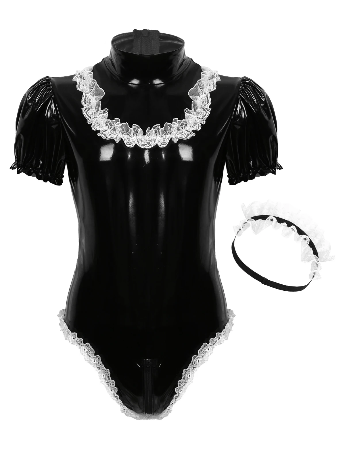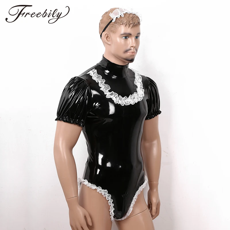 Мужские взрослые органические костюмы, Клубная одежда, латексное кожаное трико с буффами на рукавах, боди с кружевной повязкой на голову