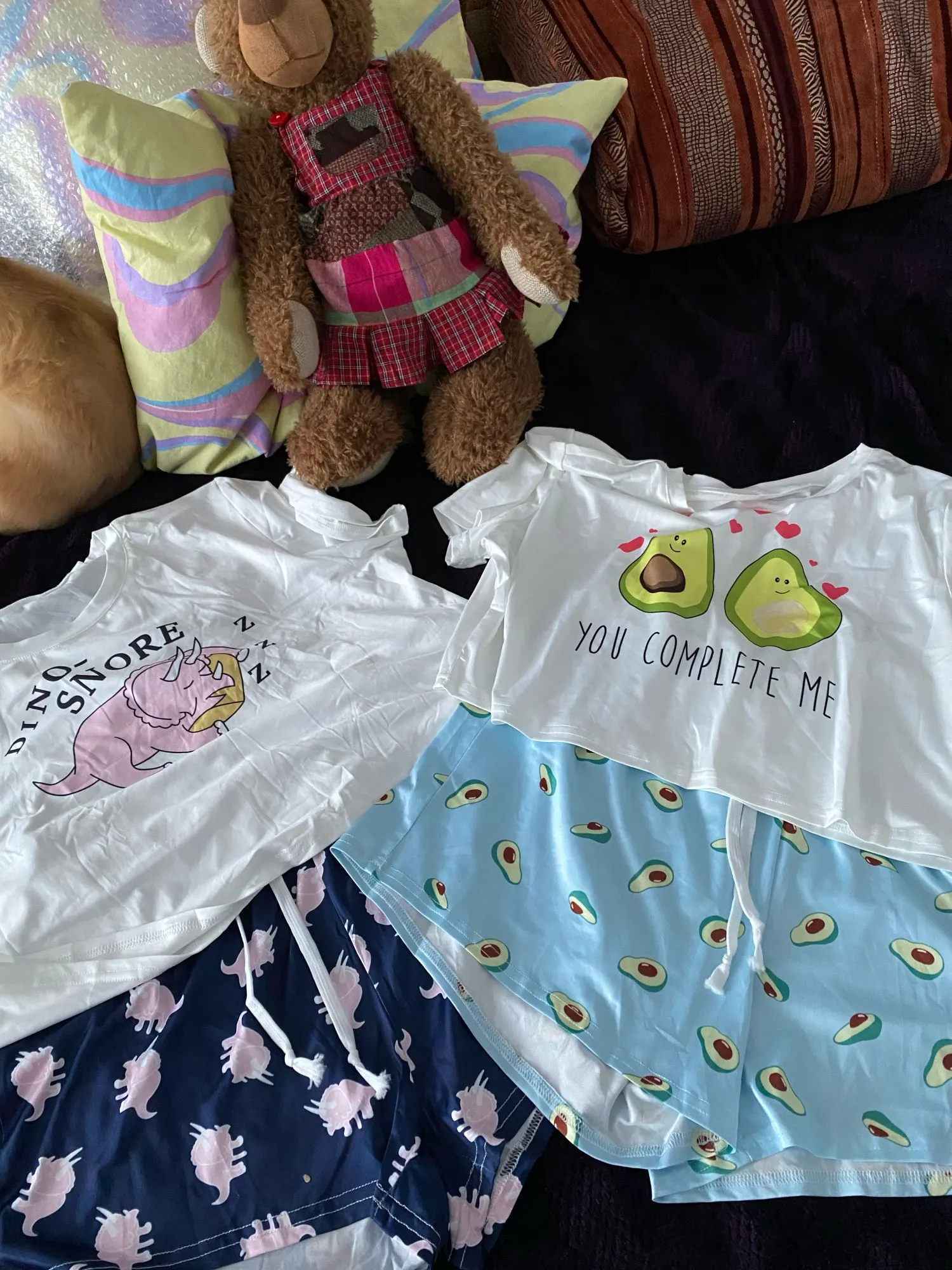 Есть два комплекта-черный и позволяет avo обнимать. Я предпочитаю черный-лучший материал и немного длиннее верхняя часть пижамы, даже если оба комплекта одинакового размера. Avo cuddle-это более синтетический, а не правильный выбор, если вы будете потеть больше. В любом случае Оба комплекта милые. Прибыла оба вместе с милой повязкой на голову в подарок. Я доволен этой покупкой!
