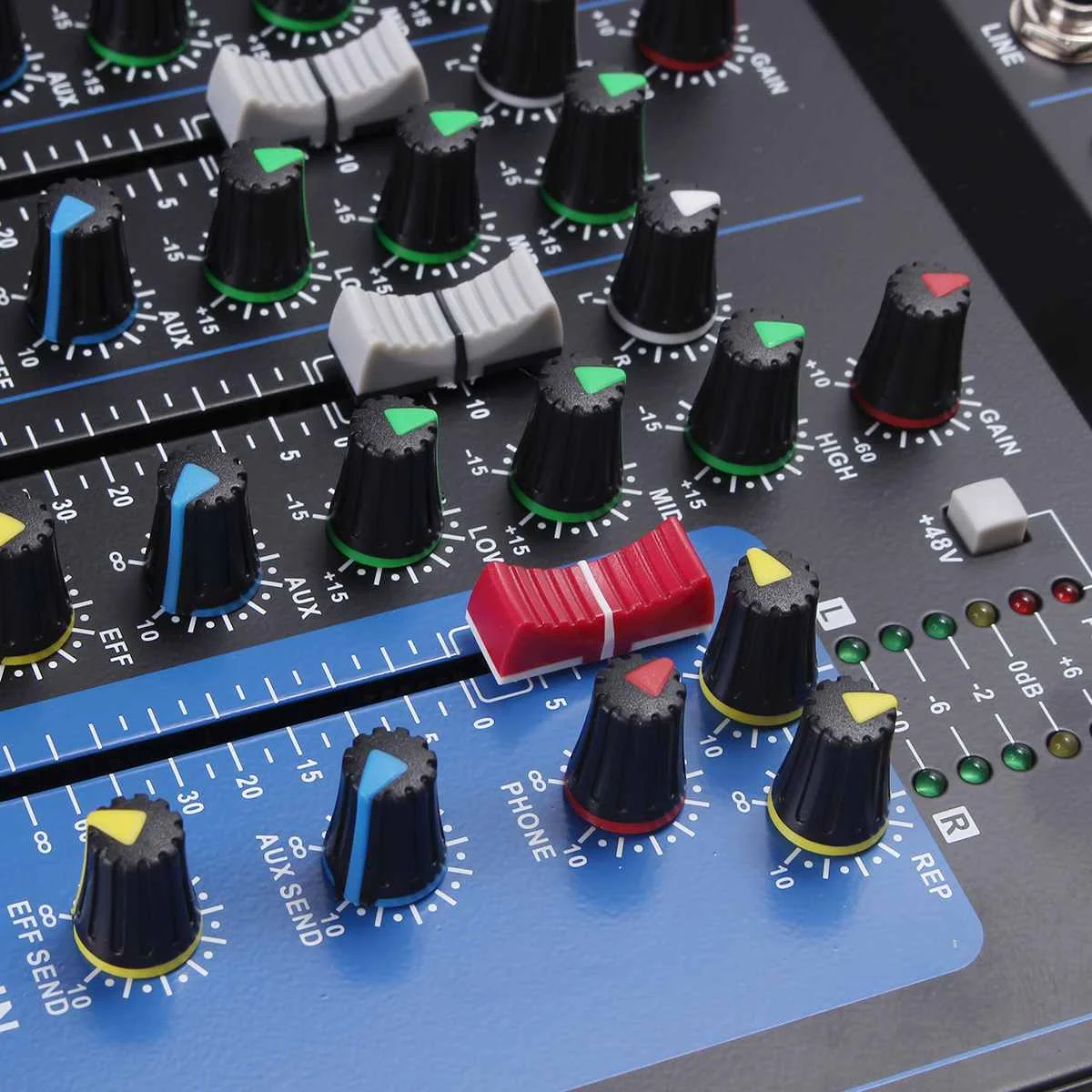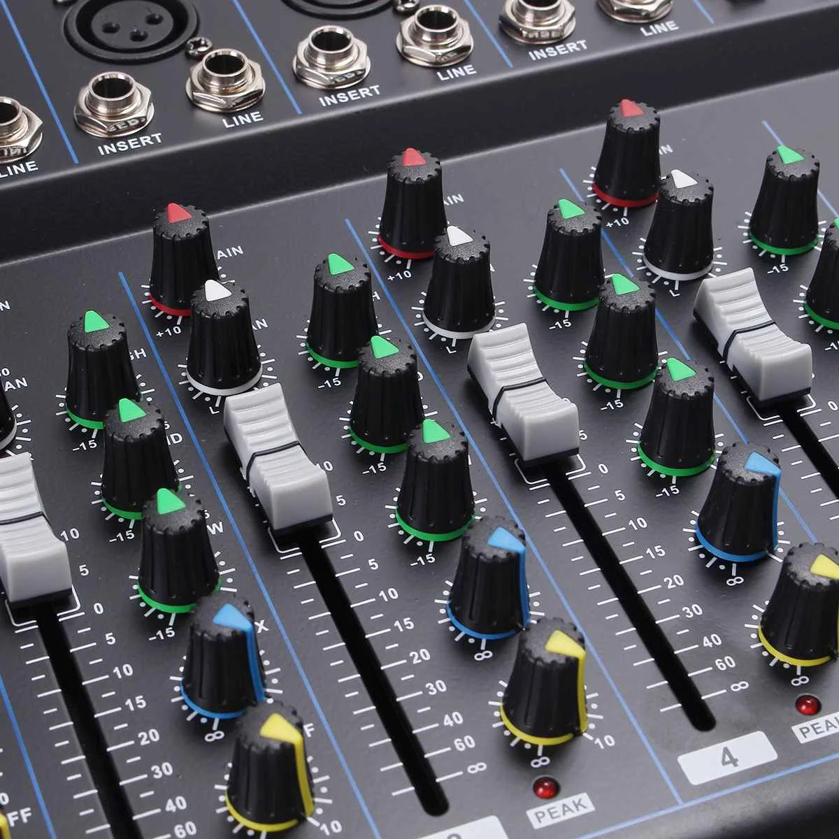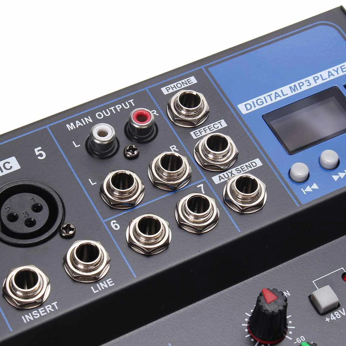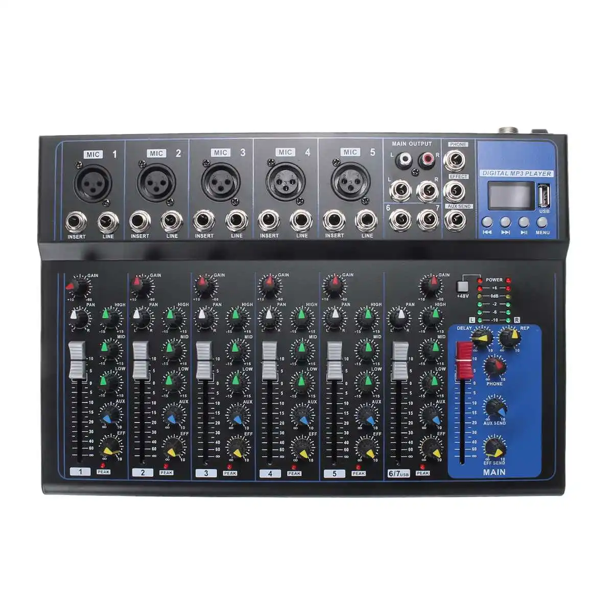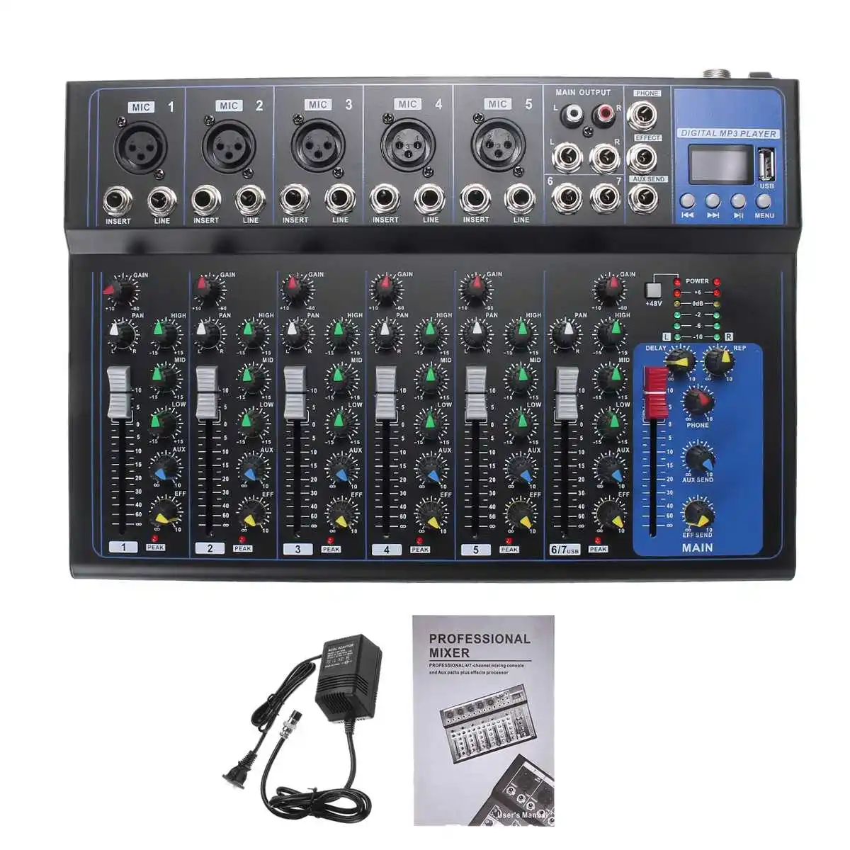 1. Функция USB.2. Микшер 7 каналов.3. 5 XLR моно входной микрофон и 2 группы стерео входных каналов.4. 3-полосный эквалайзер на всех каналах.5. Встроенный цифровой процессор с эхо-эффектом задержки6. Консоль и пути AUX плюс эффекты.7. Индивидуальное усиление, бас, средняя высота, AUX, управление.8. Стерео RCA выходы для записи9. Один AUX-выход.10. Основное управление слайдами (L + R), телефоны11. Индивидуальное эхо, пиковый светодиод на каждом входе.12. Фантомное питание 48 В для микрофонов конденсатора.13. Процессор mp3-плеер.