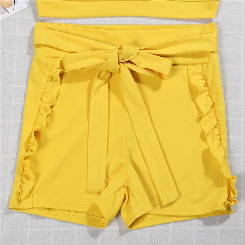 Женский летний комплект для йоги из двух предметов, спортивный укороченный топ для фитнеса, шорты с высокой талией, одежда для спортзала, повседневный костюм с оборками и бантом