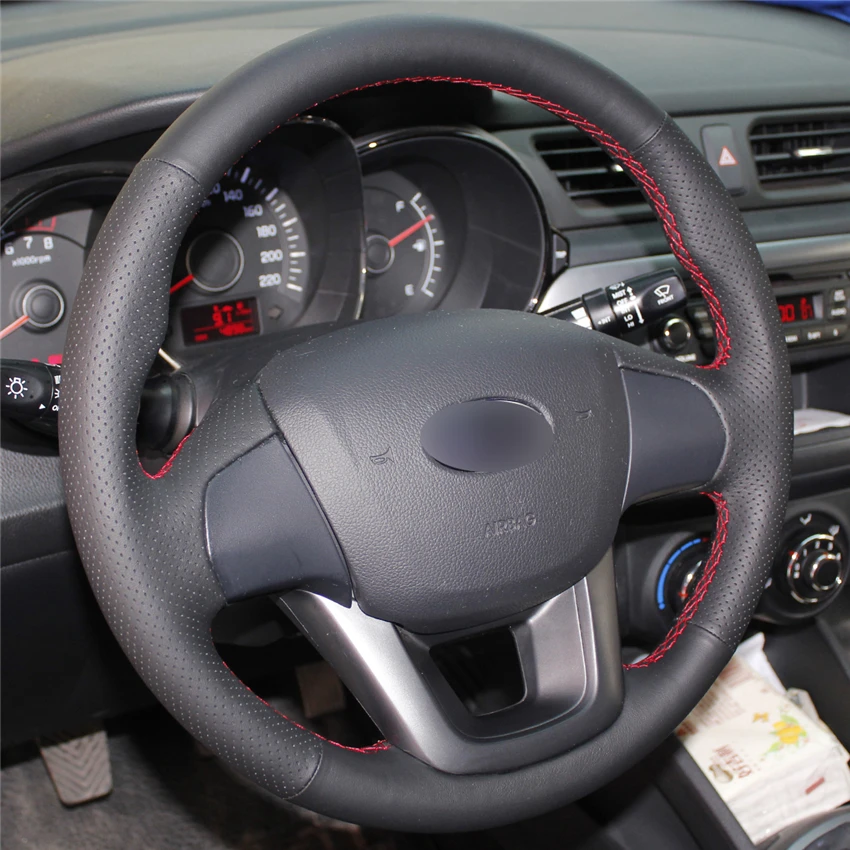 Рука Шить черного цвета из натуральной кожи, аксессуары для автомобиля Удобная крышка рулевого колеса для Kia K2 РИО 2011 2012 2013 2014 2015 2016