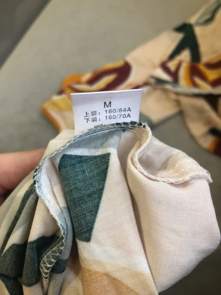 Комплект очень приятный к телу, на размер xs-s и рост 162 см размер m сел свободно, но рукава и брюки как раз. Основной цвет пижамы не белый, а розоватый. После стирки не полинял, не сел.