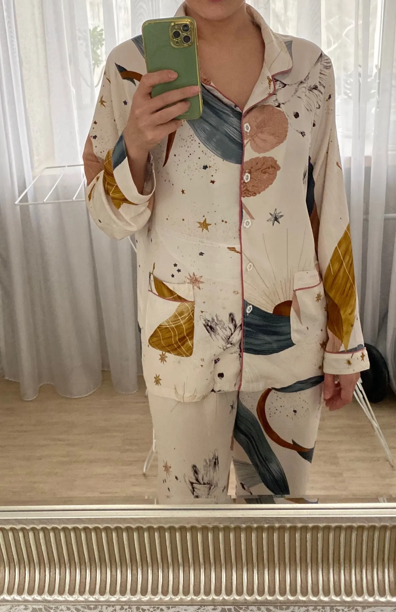 Пижамка крутейшая Материал вискоза, принт и его цвета очень нравится, смотрится нежно и стильно! Размер M сел отлично на рост 165, параметры 85-64-92. Талия на месте, ничего не висит, но и не давит - комфортно. По длине рукавов и штанин для меня тоже идеально, но кому-то может показаться коротковато.