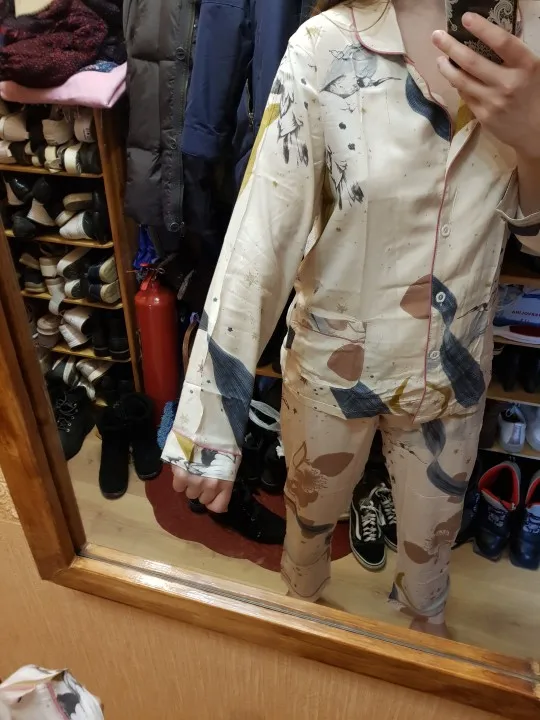 Пижама хорошая, лёгкая, ткань похожа на вискозу с примесью полиэстра, к телу приятная, все швы ровные, понравилось оформление, окантовки вокруг ворота рубашки, на рукавах снизу и на штанинах, красивые пуговки, аккуратно все, есть небольшой запах, но думаю после стирки вопрос будет решён, доставка около месяца до Перми