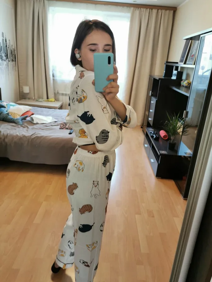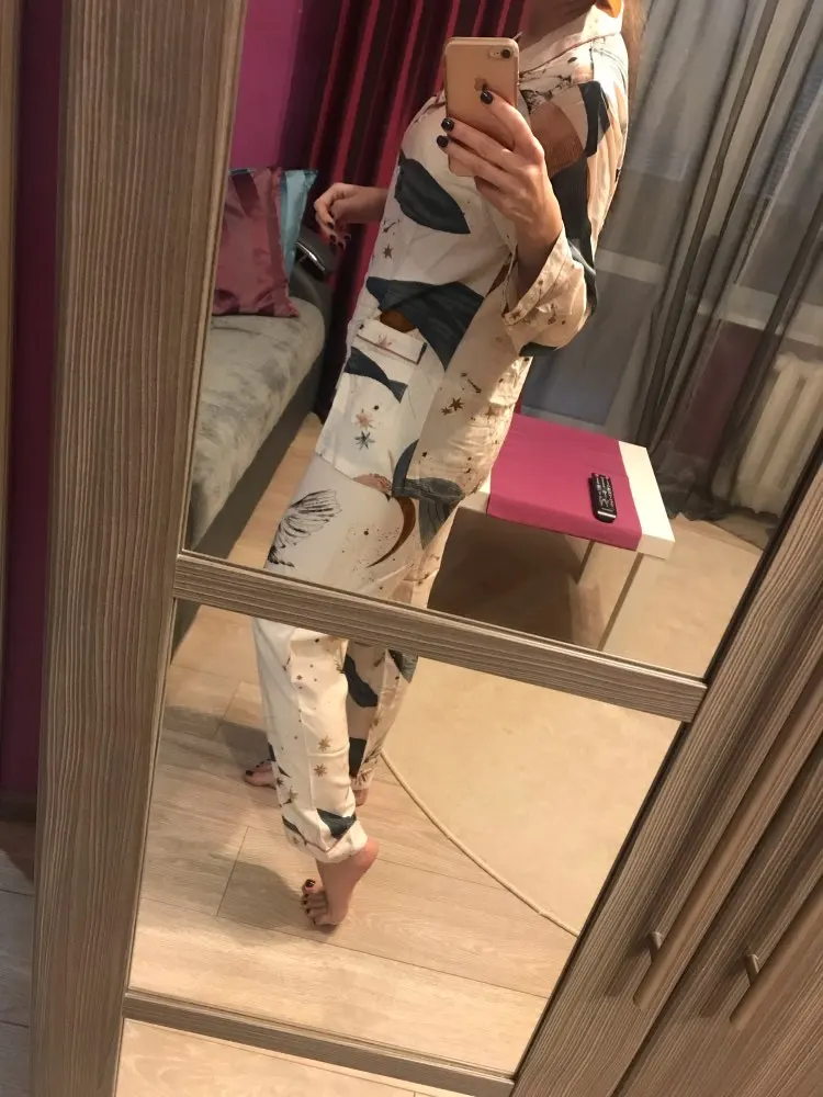 Заказывала 07.10 за 1338,42₽ в г.Сочи на почту. Продавец отправил 08.10, доставлено 19.10. Мои параметры: ОГ 85, талия 68, где бока 80, ОБ 95, рост 163. Взяла размер L, потому что дома люблю свободное, чтобы нигде ничего не давило и не перетягивало. С полной уверенность скажу, что М была бы мне идеально, но начитавшись отзывов решила не рисковать. Материал настолько классный, что в L нет никакого дискомфорта. Влюбилась в пижамку, качество отличное, материал настолько приятный к телу, надеваешь и не хочется снимать!! Все строчки ровные, с изнанки кое-где торчат нитки, но они элементарно убираются. Стирку пережила без всяких изменений. ДА, пижама мнётся, но меня ничего не смущает. И ещё, где нет рисунка она просвечивает, у меня такой кусочек прям на груди, так что если нагрянут соседи (гости), лучше надеть лиф или топ.