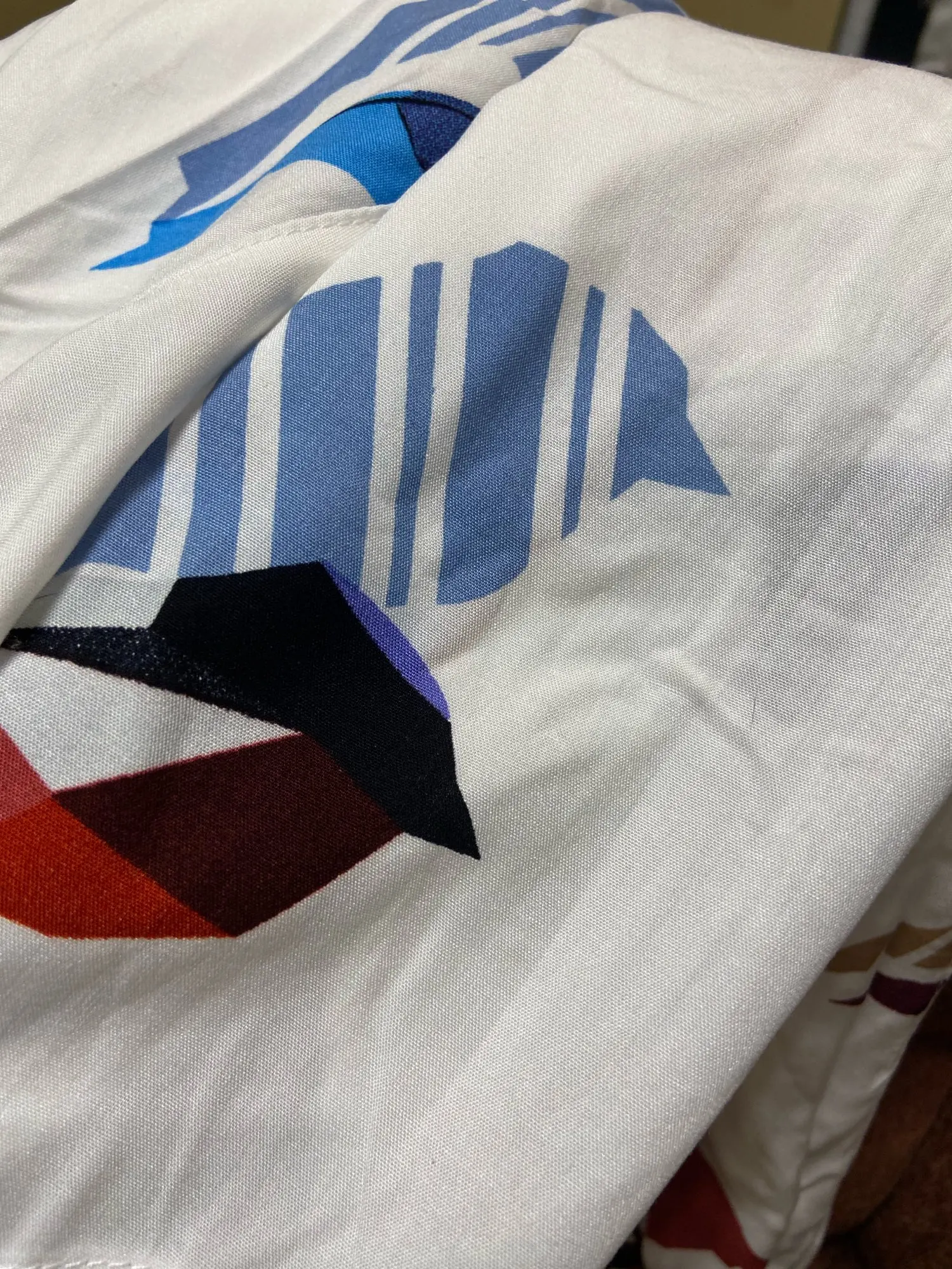 на 44 взяла L,надо было на два размера меньше брать))))состав 100% чего-то там,(вся информация на китайском)ткань холодная к телу,посмотрим как она будет зимой,цвета и рисунок четкие и яркие в целом довольна,только с размером не угодала!