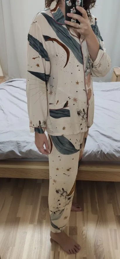 отличная пижама, очень приятная на ощупь, долго выбирали расцветку- оказалась очень удачной. на 44 размер заказали l, сидит отлично, меньше не надо