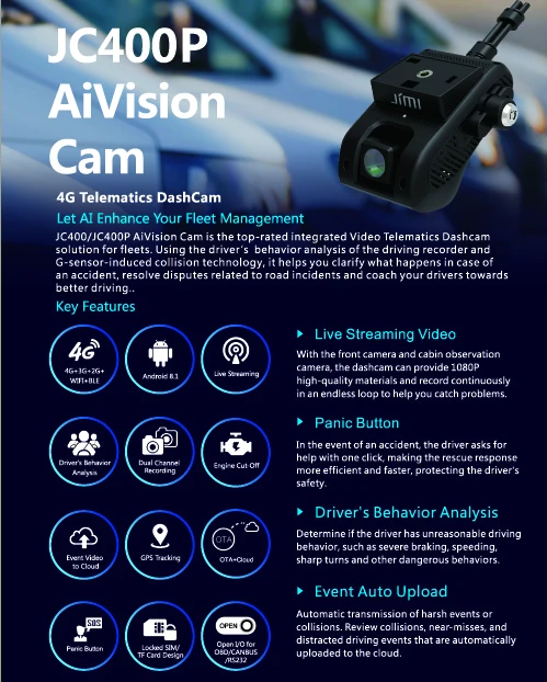 JC400P AiVision Cam является топовым интегрированным решением для видеотелематики dashcam для флотов. Это будет решающим инструментом для обеспечения безопасности на дороге и защиты от противозаконной деятельности. С четкой видеозаписью 1080p HD при 30 кадрах в секунду на широкоугольном объективе 140 градусов, JC400P может получить каждую деталь. Он автоматически обнаружит столкновения и сохранит эти видеофайлы позже, чтобы вы не потерялись. Для тех, кто проводит достаточное количество времени, путешествуя по дороге, это обязательный продукт.