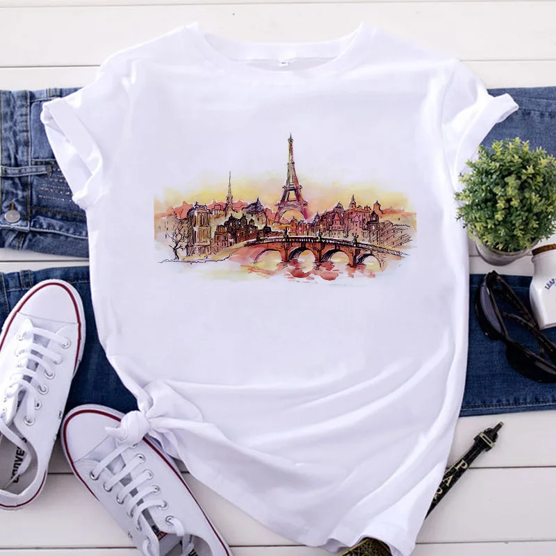 Женская футболка с принтом Эйфелевой башни, с коротким рукавом