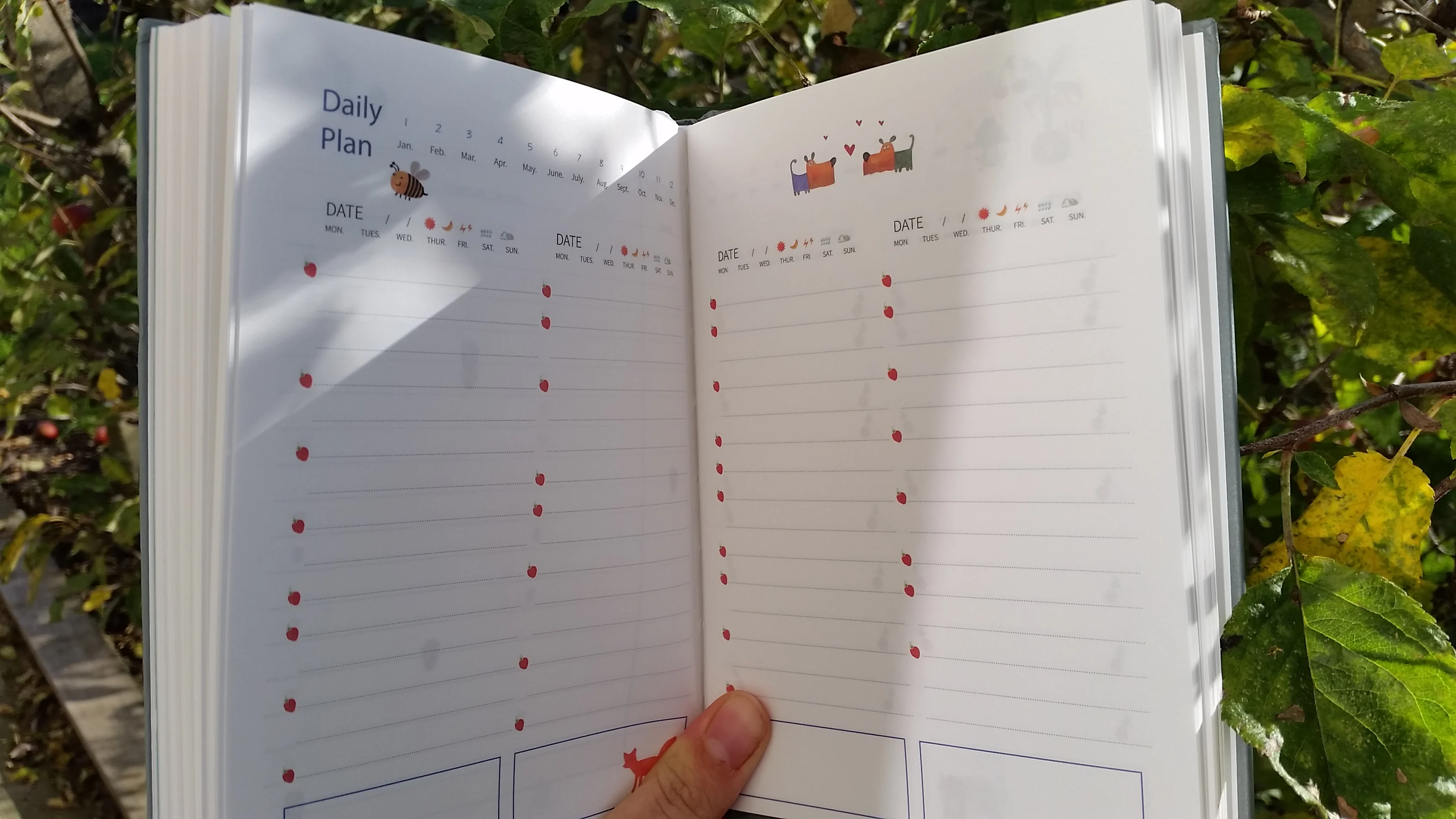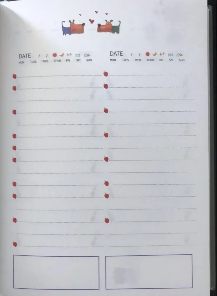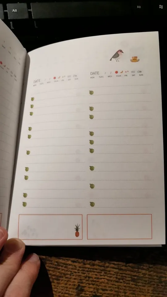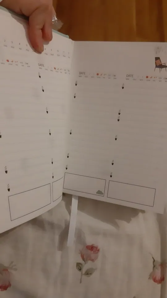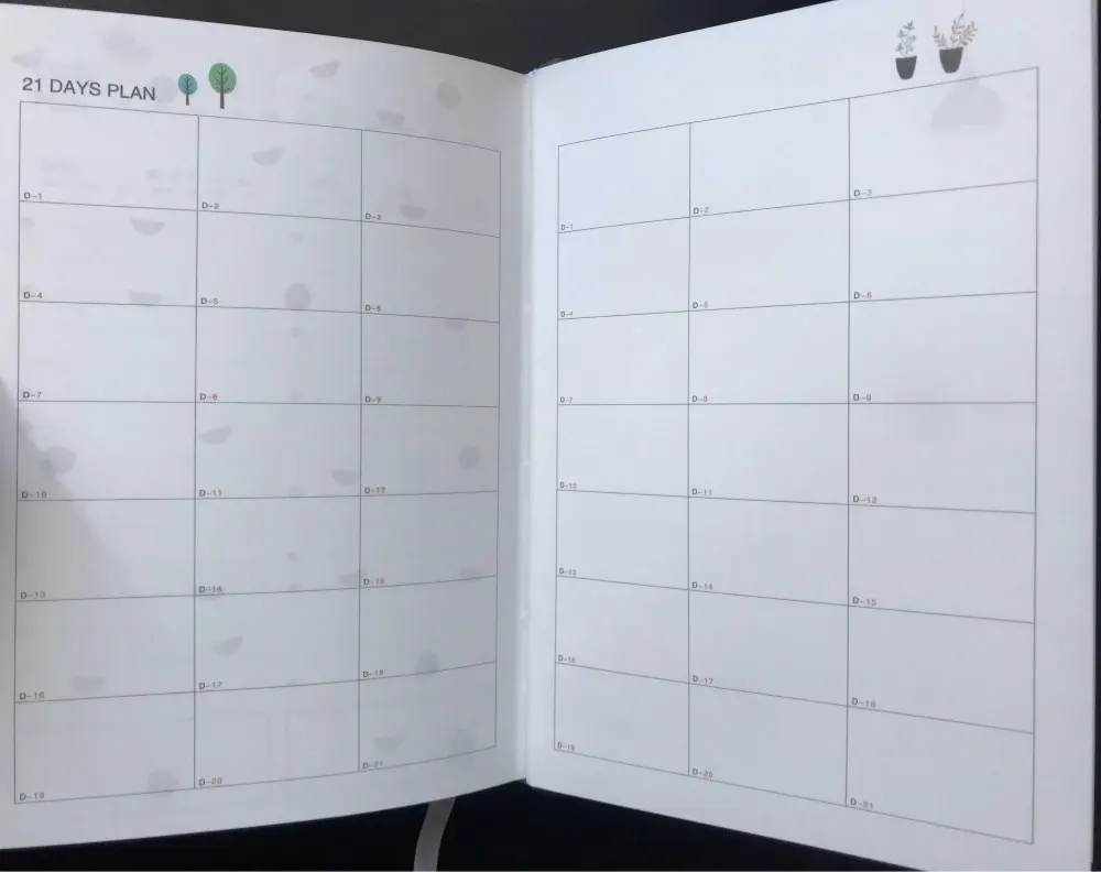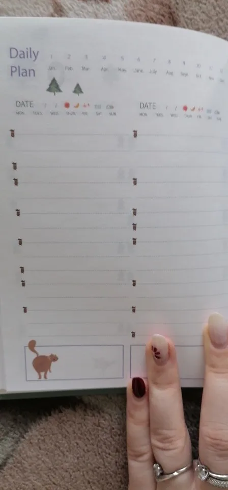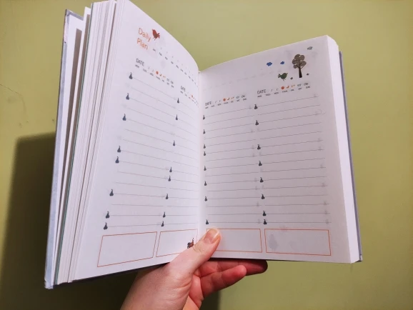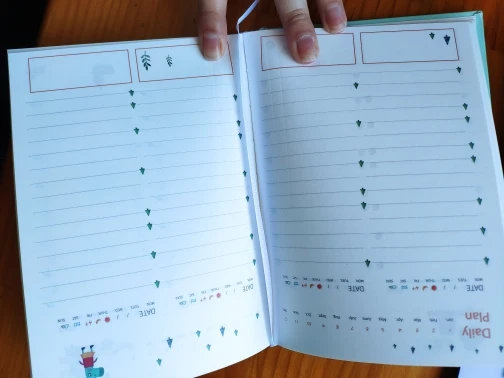 Немного покоцали при доставке. Развороты милые, все красивое и аккуратное, НО. Рисунки посреди графы для заполнения мешают + развороты идут так: 2 разворота на полгода, потом 12 разворотов на месяц и дальше только развороты по дням. А не проще ли было бы сделать разворот на месяц, а потом разворот на дни, потом опять на месяц и опять на дни? Плюс развороты на дни делятся на 4 дня, что не соответсвует логике ни единого мозга, получается, что на каждом втором развороте у меня один день будет лишним, либо развороты собьются до ужаса. В конце есть ещё два разворота по 21 день. Зачем, а главное - почему? В целом отличный ежедневник, на английском, но система бедовая