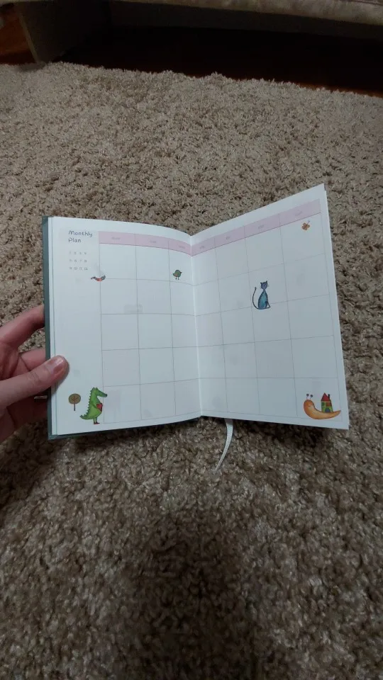 очень классный блокнот потрясающего цвета с приятными наощупь слегка глянцевыми страничками . внутри нет четкой разбивки по датам и годам ,можно вписывать свои даты . смешные и милые иллюстрации на страничках . спасибо ,продавец доставил товар очень быстро !