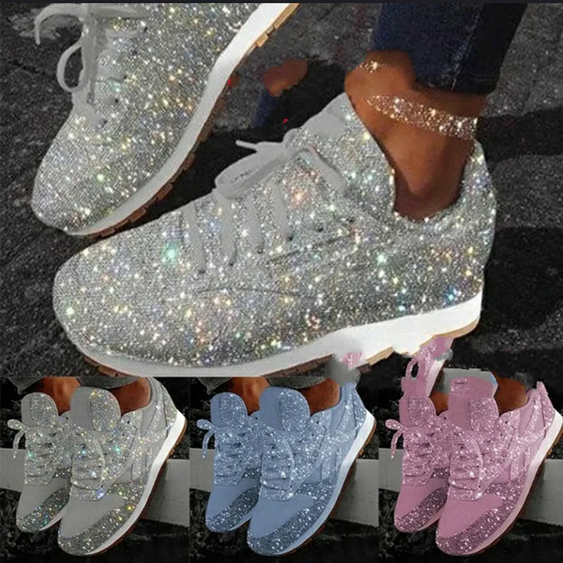 Женская обувь на плоской подошве с блестками; Кроссовки; Повседневная женская обувь из сетчатого материала на шнуровке с украшениями на платформе удобные размера плюс; Туфли с подошвой из вулканизированной резины 2020 мягкая пряжа